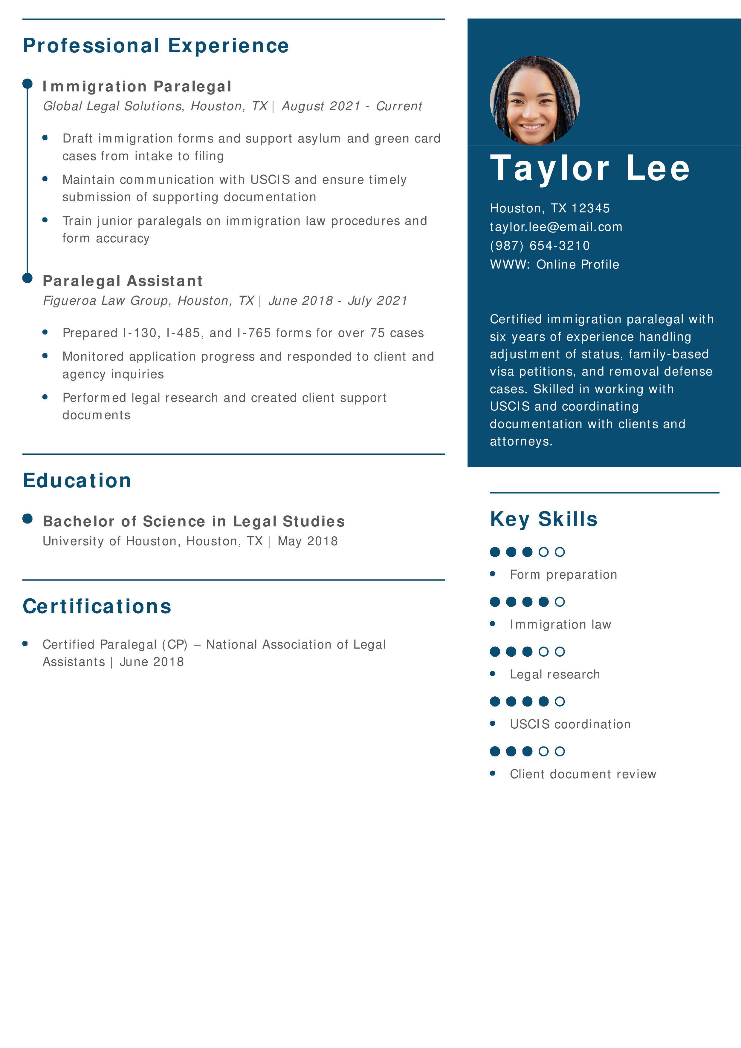 This resume demonstrates niche expertise in immigration law, backed by form-specific knowledge and measurable impact. Team training and legal correspondence with USCIS show leadership. Learn how to highlight niche legal knowledge in technical skills for resumes.