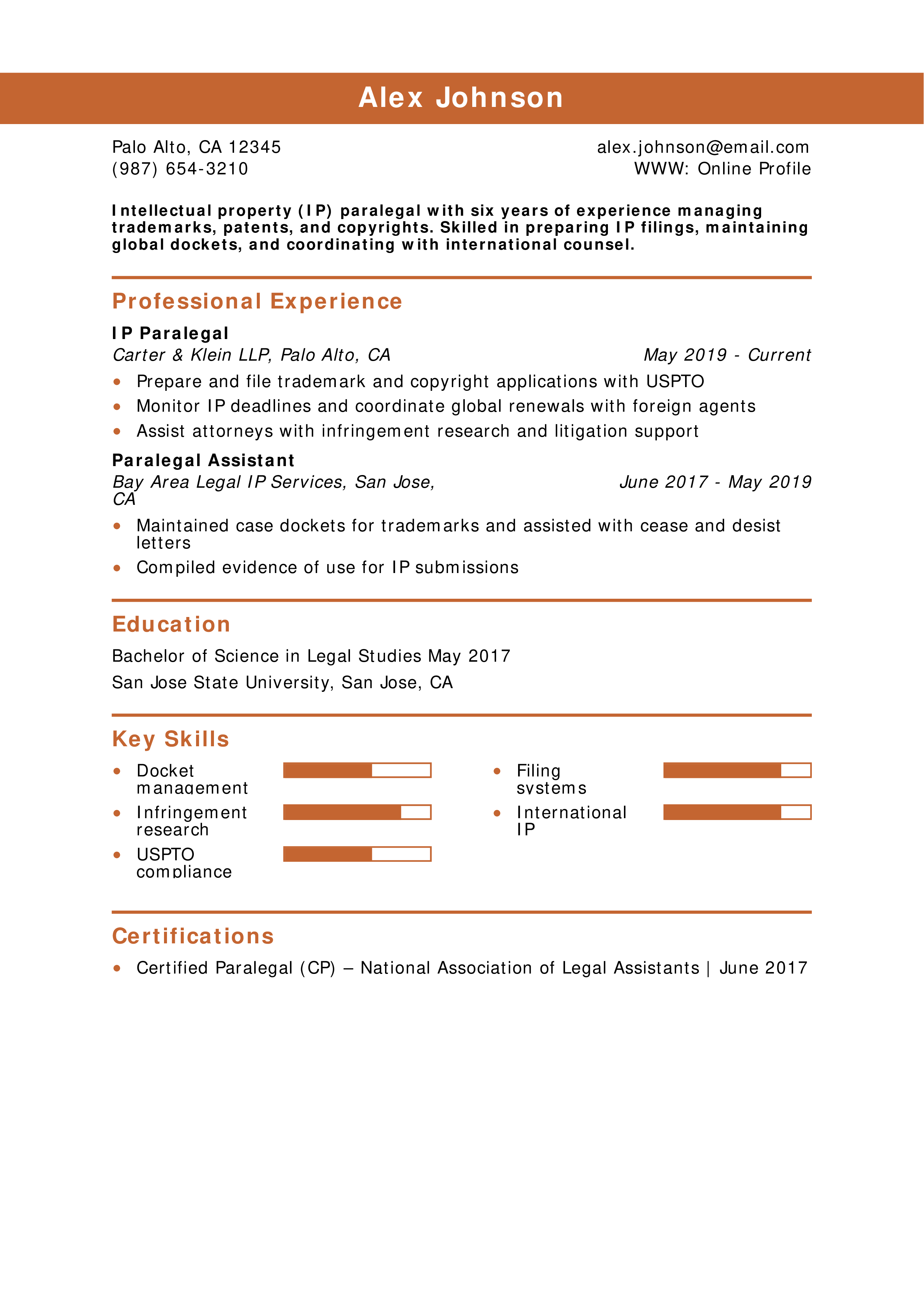 Paralegal jobs typically require a strong blend of research, technical, and client relations skills. While you can highlight these skills in your Experience section by relating them to specific cases or achievements, a Key Skills list lets you gather them all in one easy-to-read section for hiring managers. Consider including any of the below terms.
