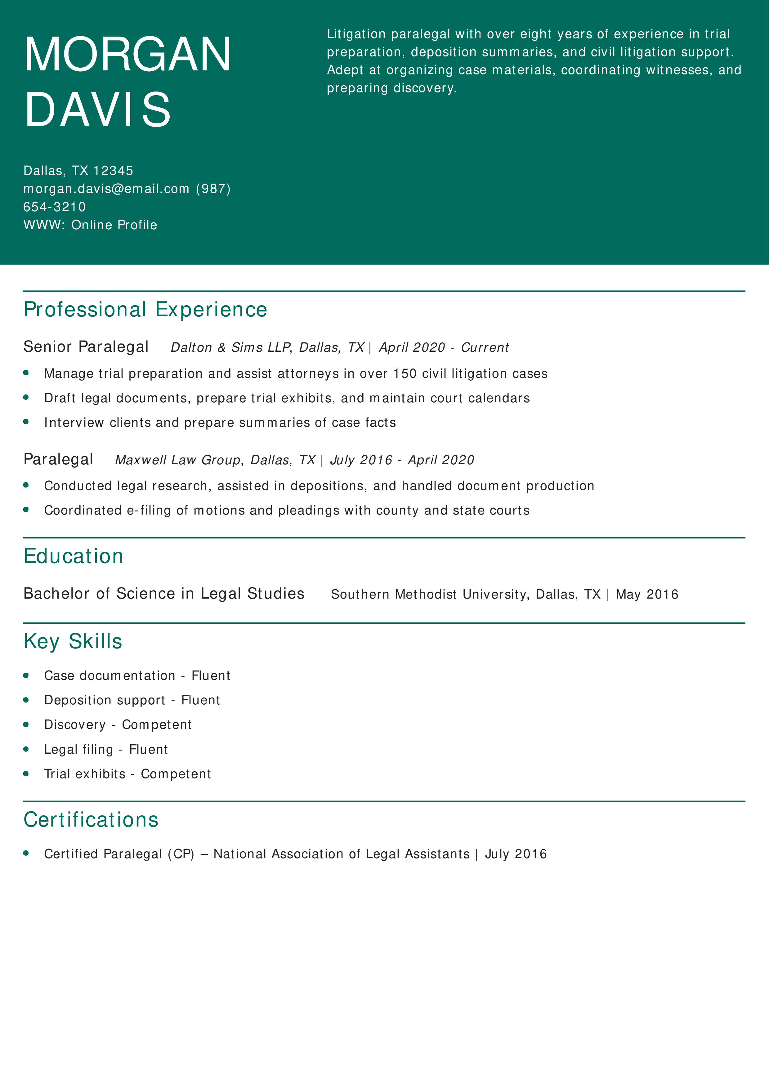 Using a template can make it easier to draft and customize a polished resume for each paralegal application. Look for clean and simple templates, with enough white space that the page doesn’t seem cluttered. Law firms deal in paperwork all day, so showing how a crisp professional document should look can help make a good impression.