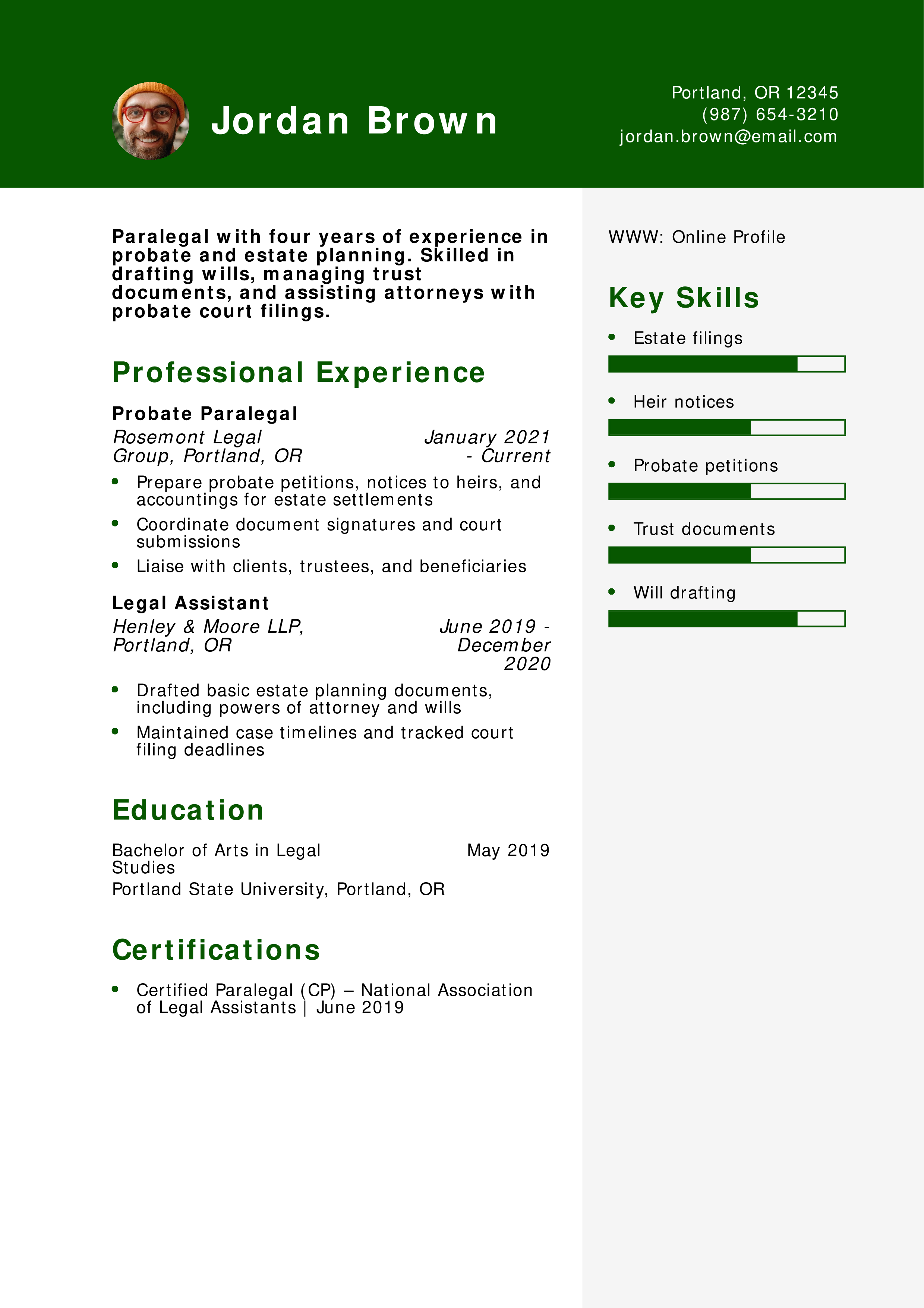 This resume focuses on probate-specific experience, clearly emphasizing communication with heirs and filing accuracy. It reflects the attention to detail necessary in estate law. Learn how to highlight precise work at resume interests section.