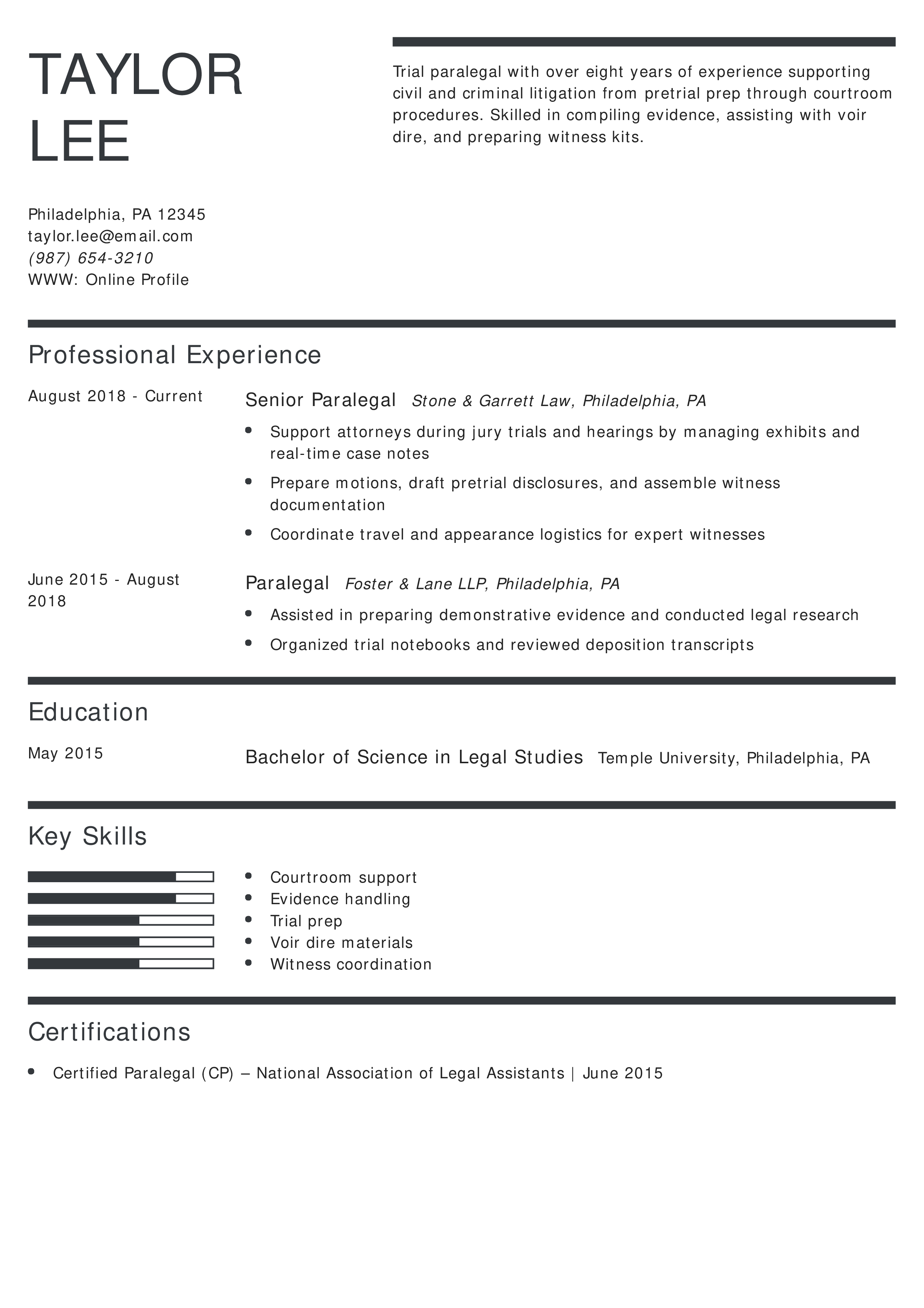 This resume focuses on trial-specific experience with courtroom tasks and pretrial documentation. Including logistics and witness management makes it highly relevant. For more tips on listing trial-related skills, see resume skills.