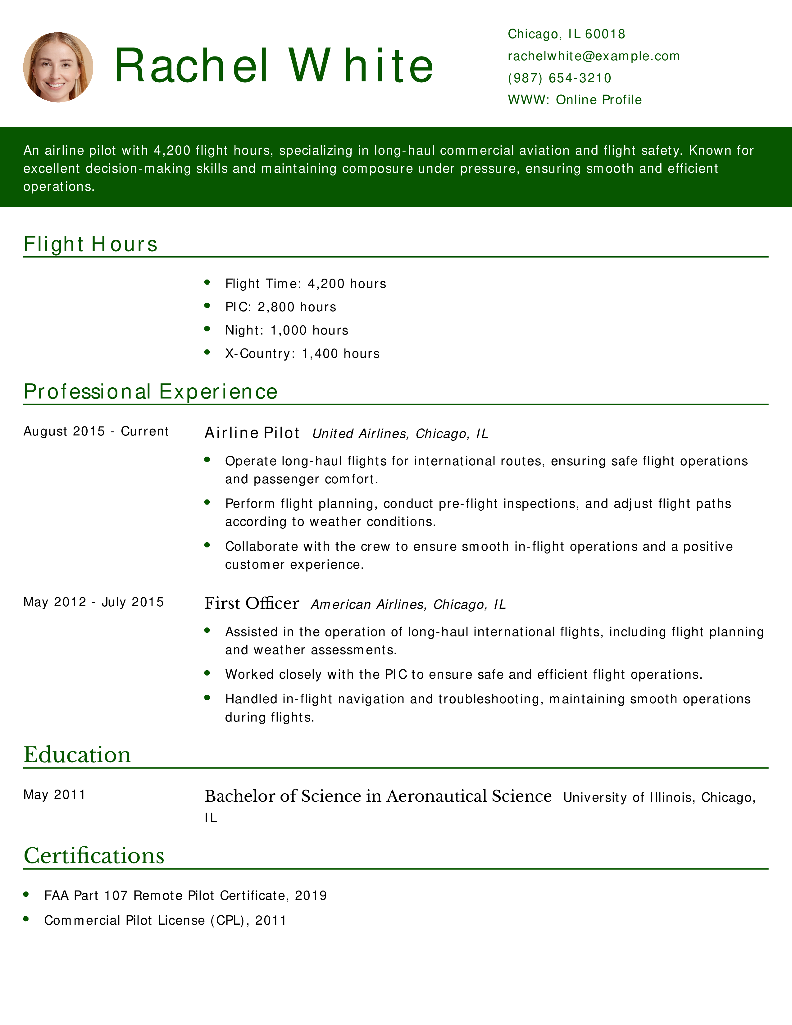 This pilot resume summarizes the candidate’s experience in the profile statement and immediately lists the candidate’s flight hours in an easy-to-scan format.