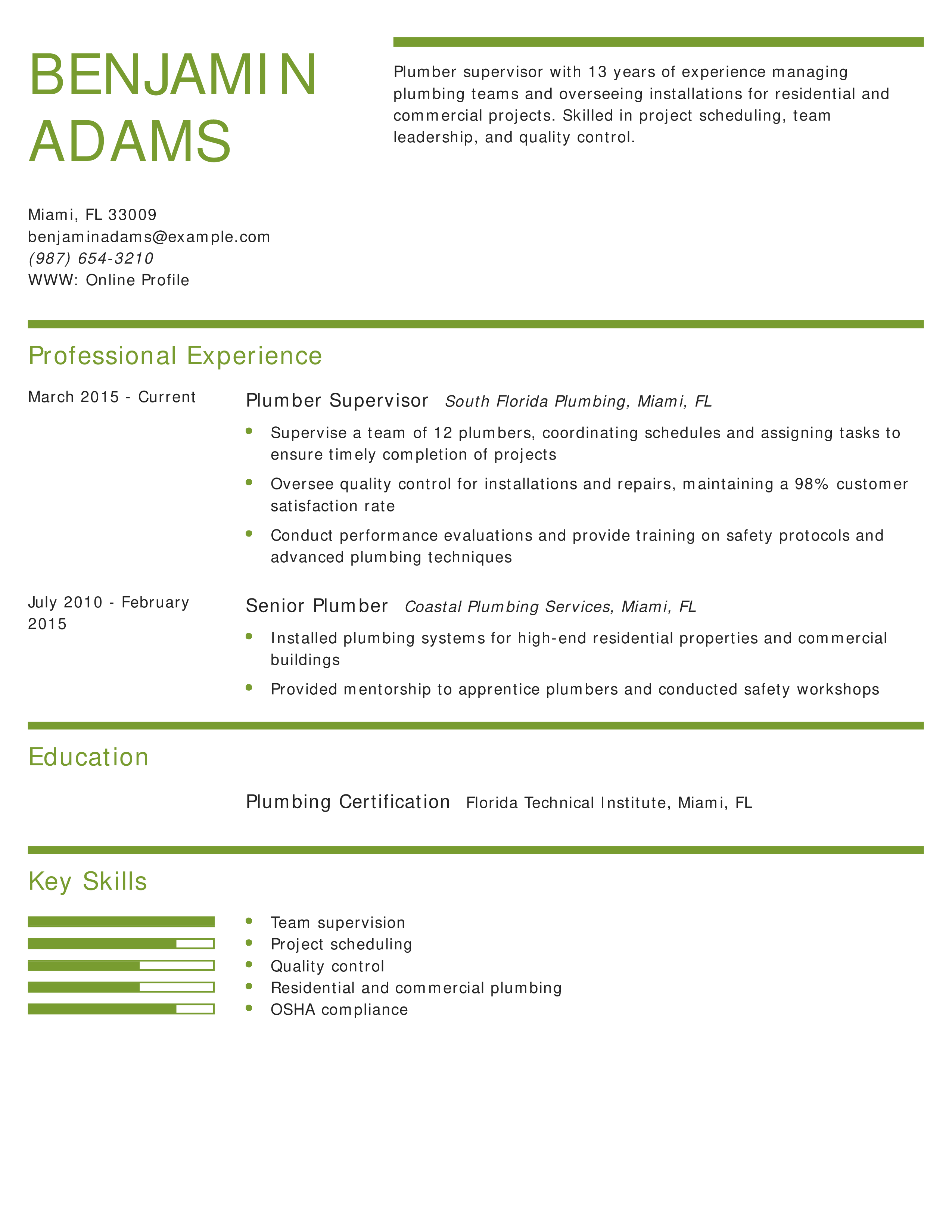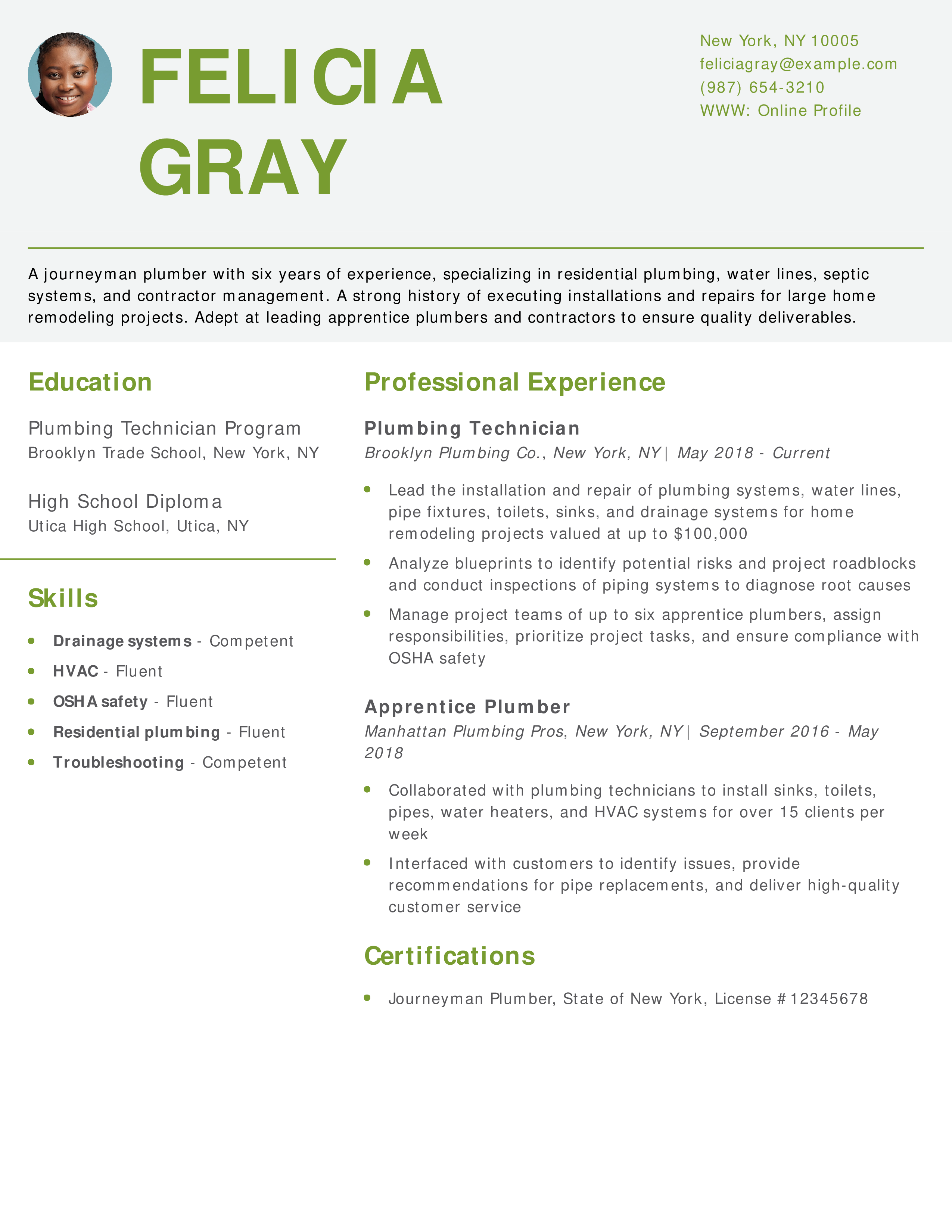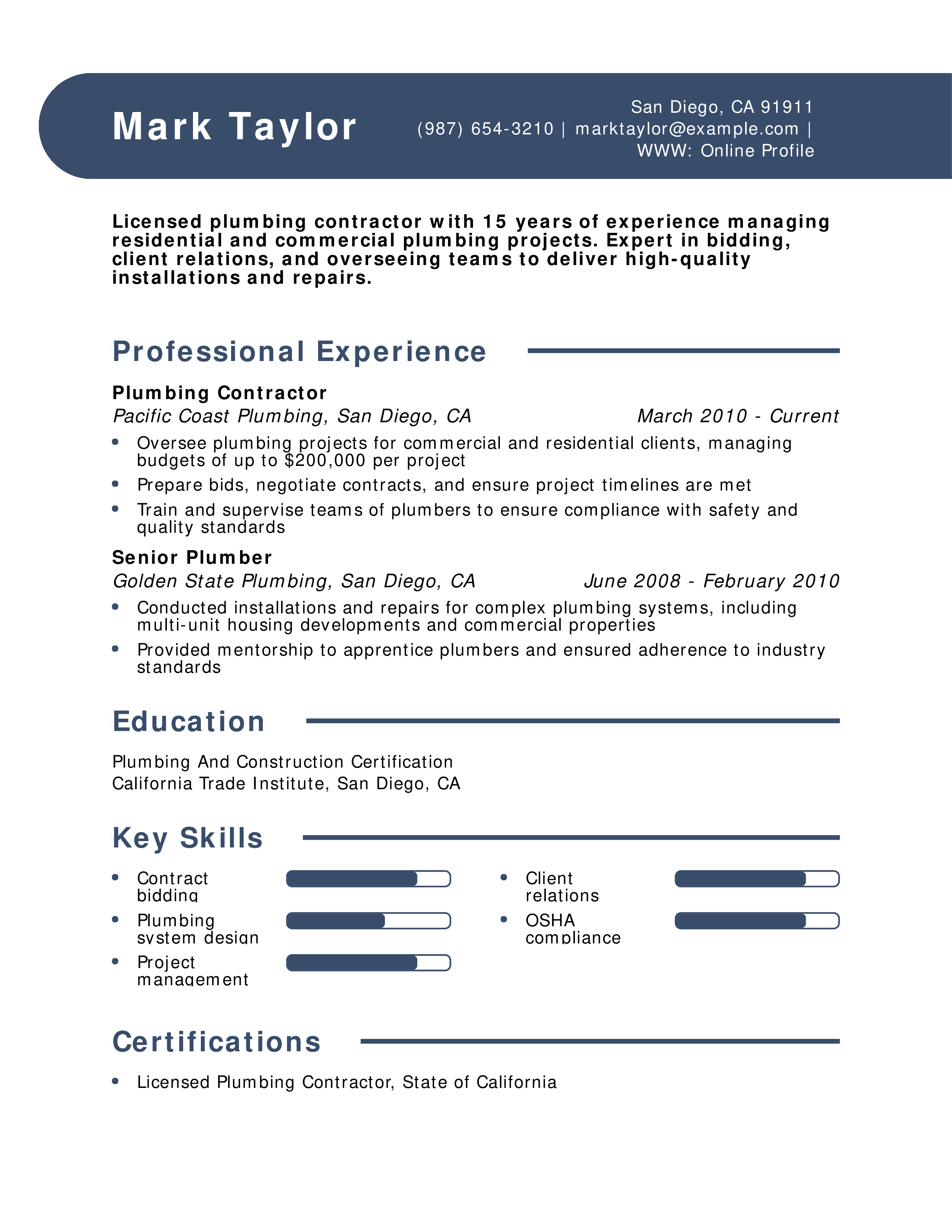 Reverse chronological resumes are the gold standard, and there’s no reason why a plumber resume should take a different approach. It’s simple and familiar, and hiring managers can quickly see your most recent work highlights to determine if you’re a strong candidate for their role. Functional resume formats, which highlight core competencies and skills groups rather than focus on job history, are more complex and better suited for career changers or people with large employment gaps.
