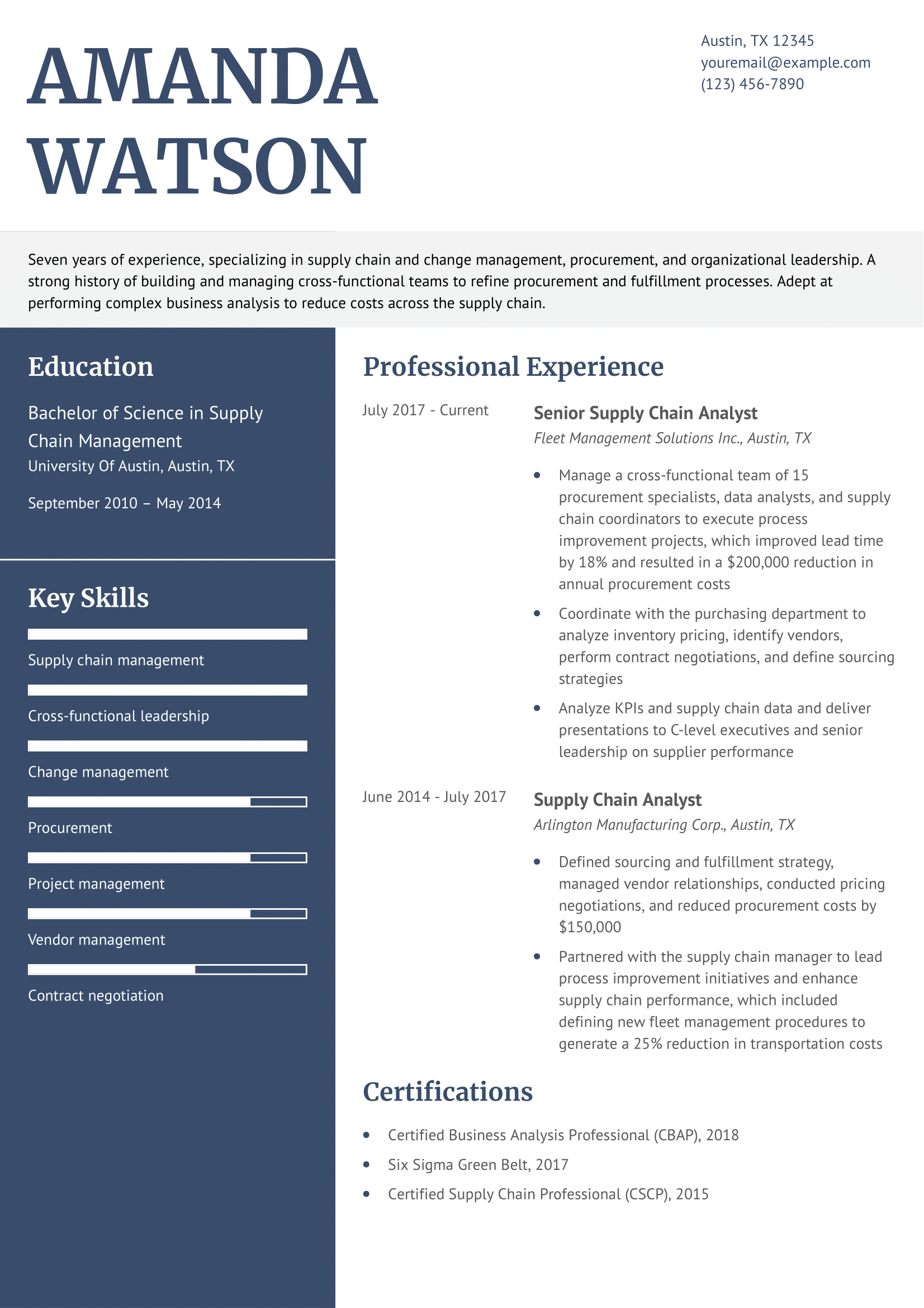 A good procurement resume shows you can help companies obtain outside services and materials promptly and cost-effectively. Focus on your related skills like contract negotiation and supply chain management, and spell out how your work helped raise organizations’ efficiency or bottom line. With this guide, you can create a results-driven resume showing your best procurement experience.