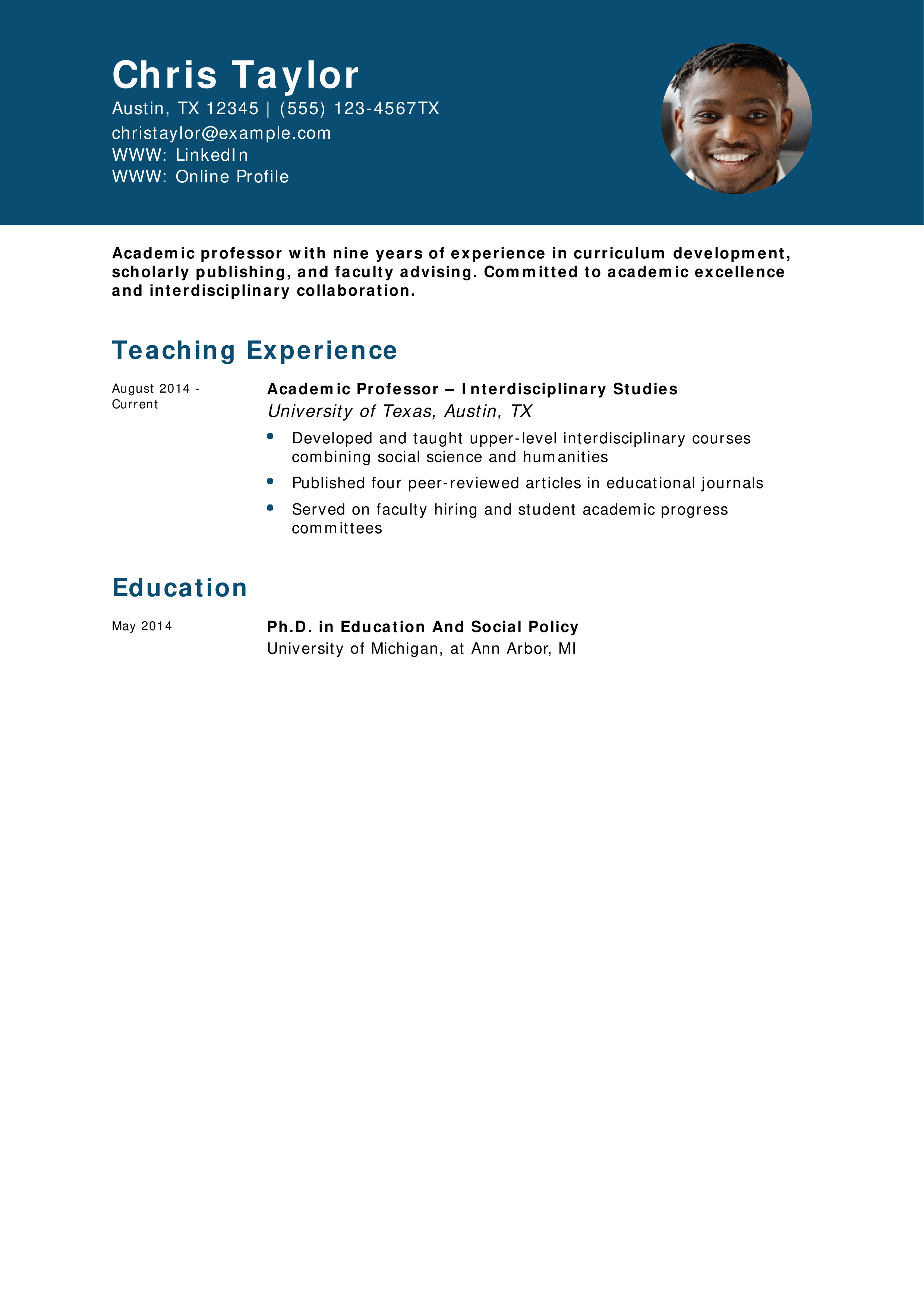 What kinds of schools and campus communities have you taught? Has your work been characterized by certain class sizes, student demographics, or teaching philosophies? Consider details like these when looking at professor jobs that interest you. If a posting includes information on the school that overlaps with your background, mention that in your CV’s intro. This extra step will make your CV more relevant to the job opening at hand and help attract the hiring manager’s notice.