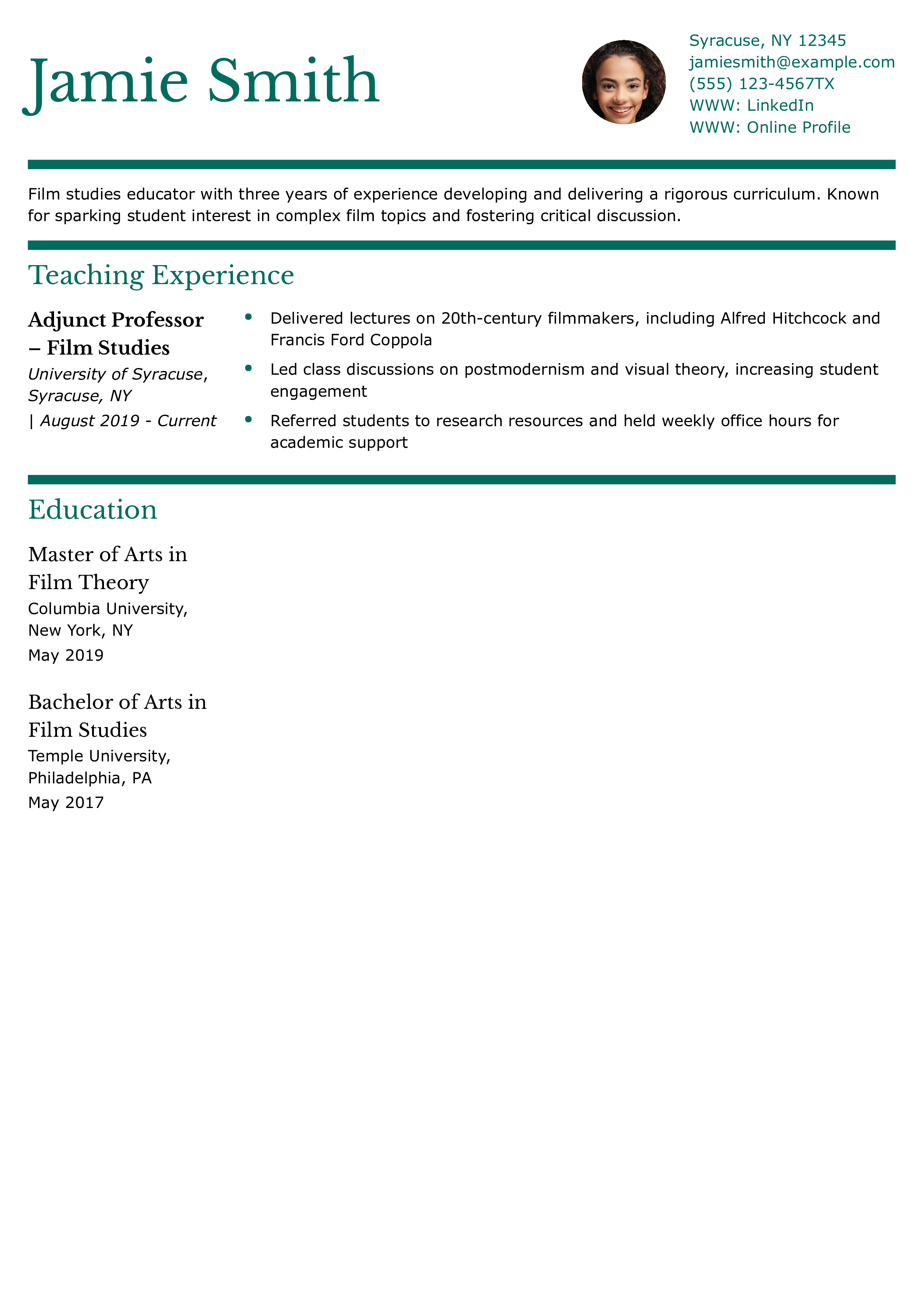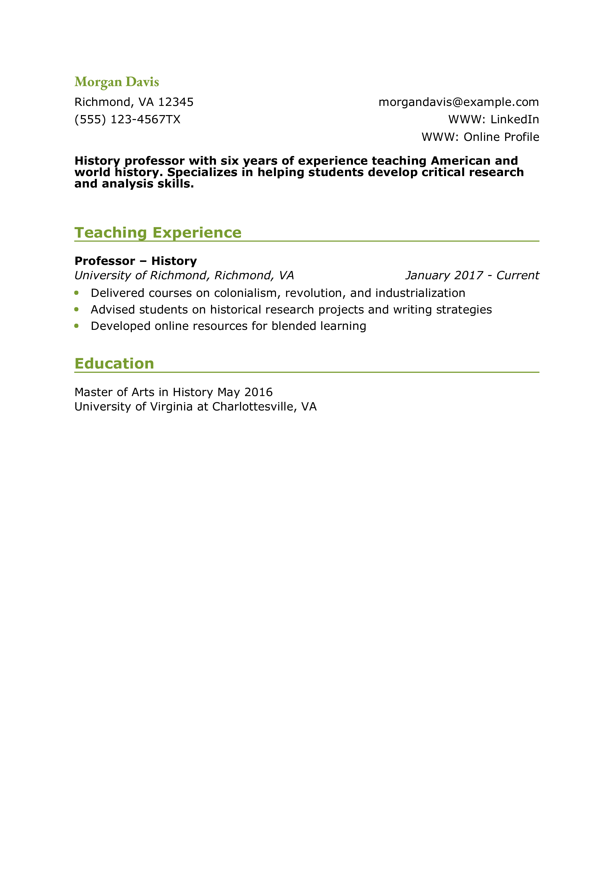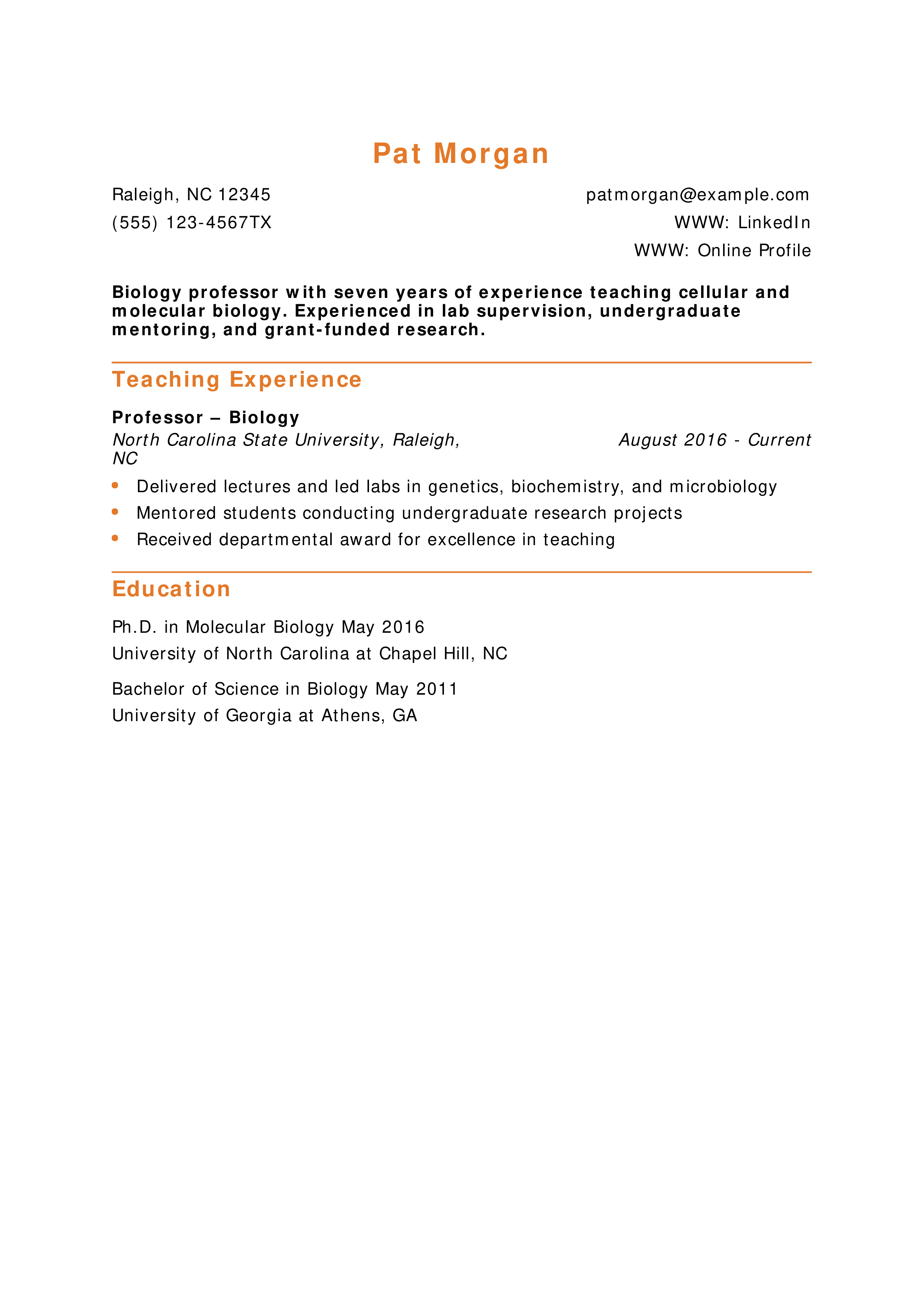 This resume is good because it shows a consistent teaching record and commitment to student development. Learn how to optimize academic resumes at what to put on a resume.