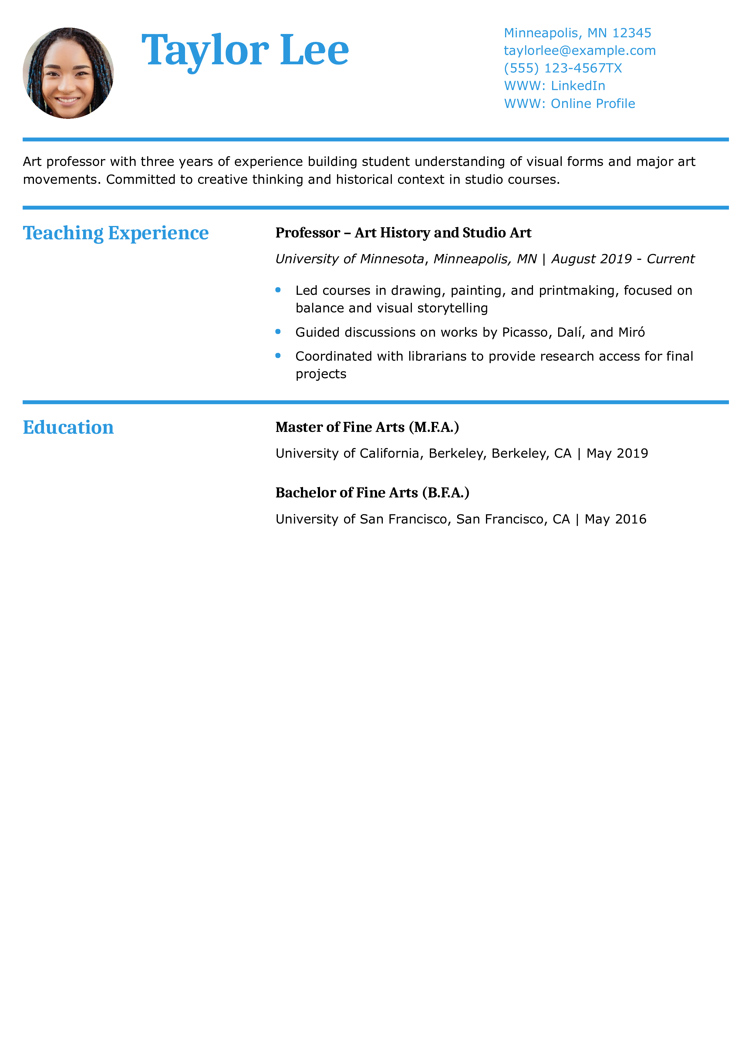 This resume works well because it integrates practical studio teaching with art historical depth. To enhance visual clarity in your resume, see best font for a resume.