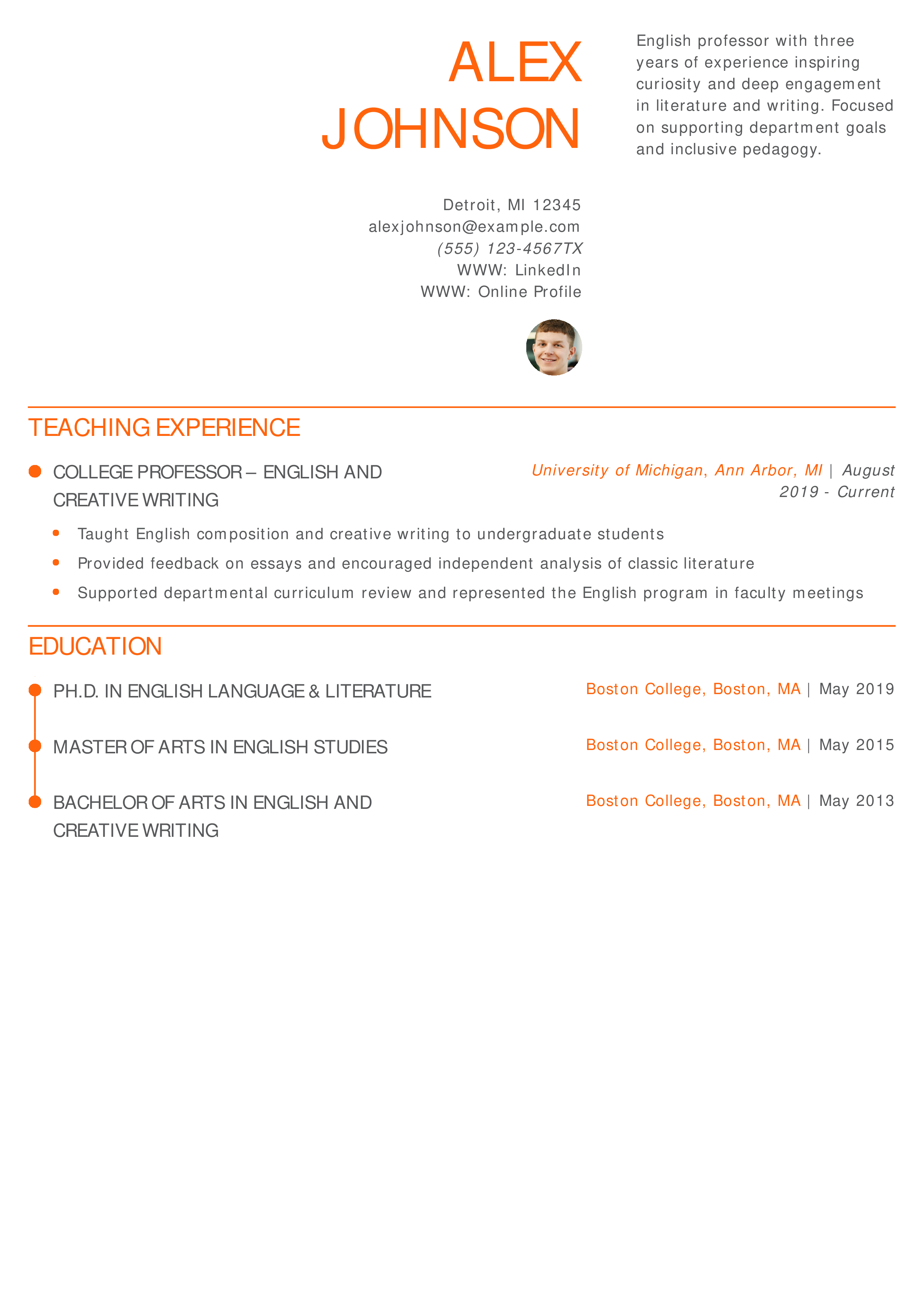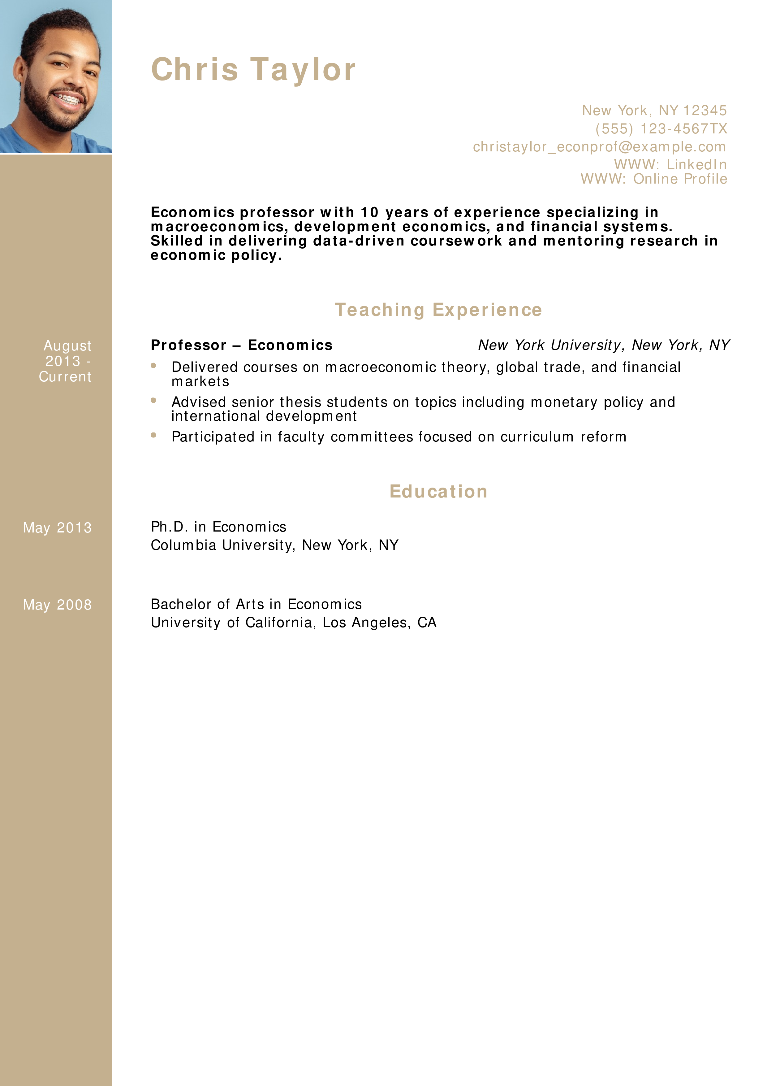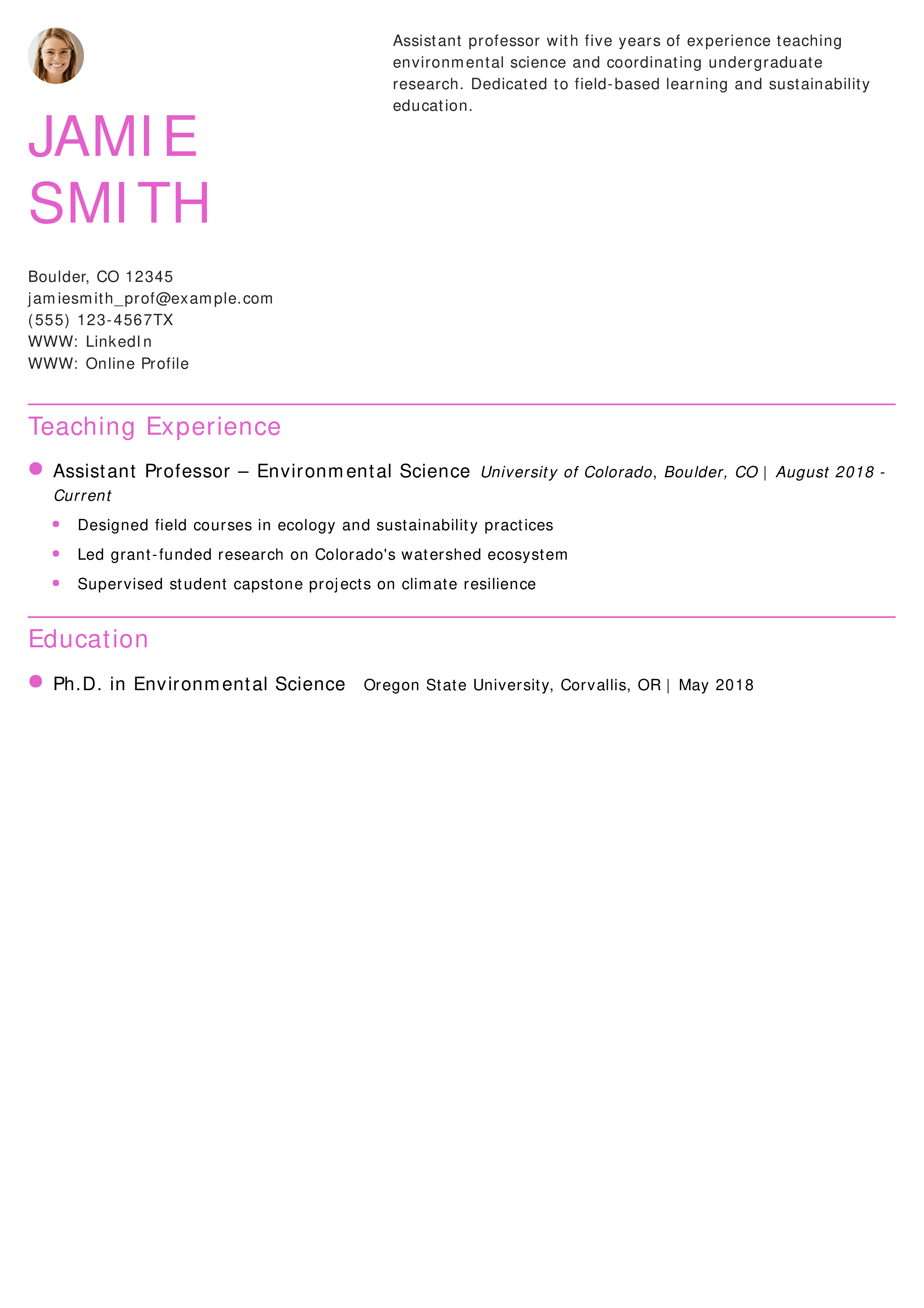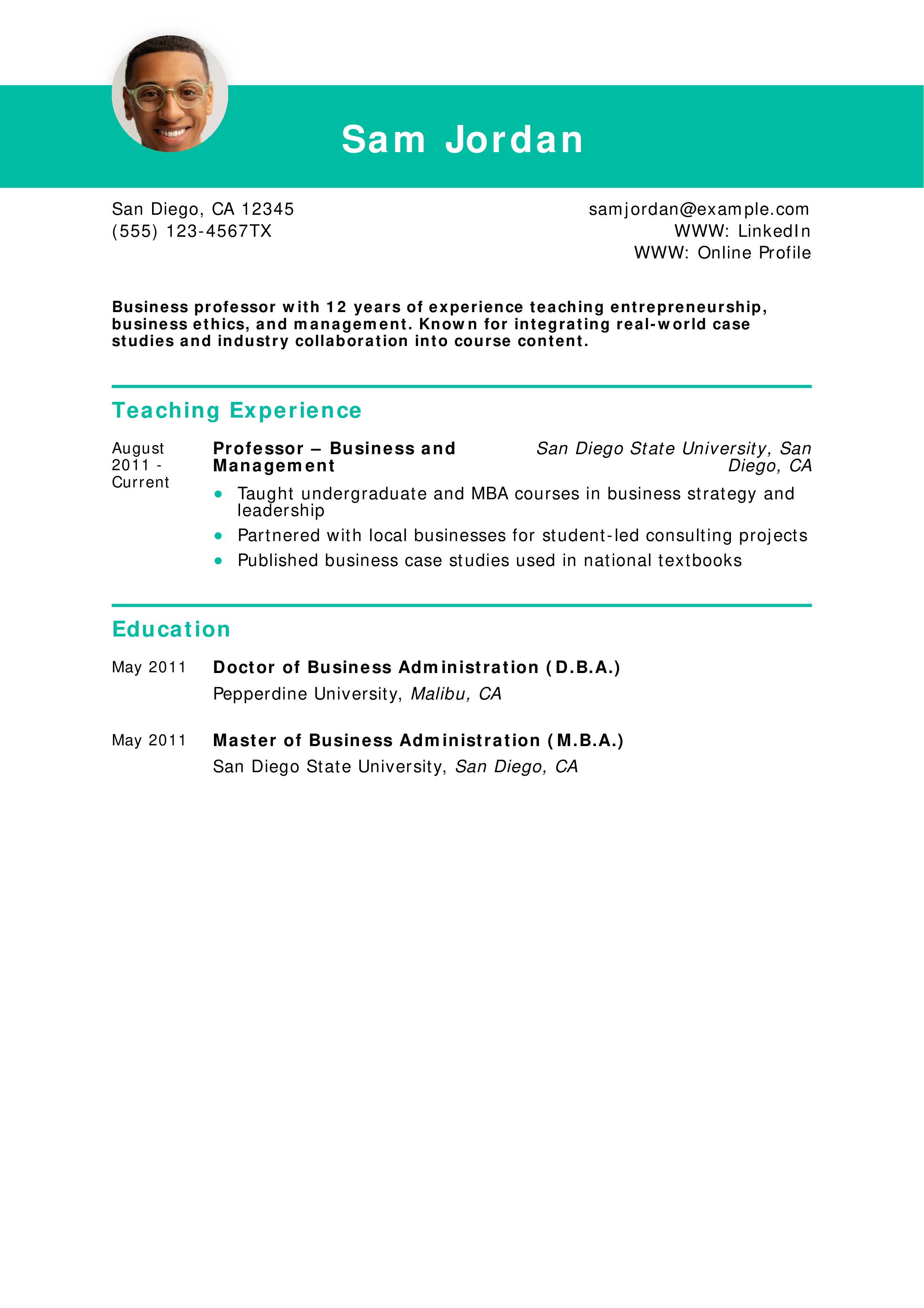 According to the U.S. Bureau of Labor statistics, the median annual wage for postsecondary teachers was $80,840 in May 2022. Overall employment of postsecondary teachers is projected to grow 8% from 2022 to 2032, faster than the average for all occupations. Craft a great CV to catch the eye of the institution you want to work for to get a great job in this space.