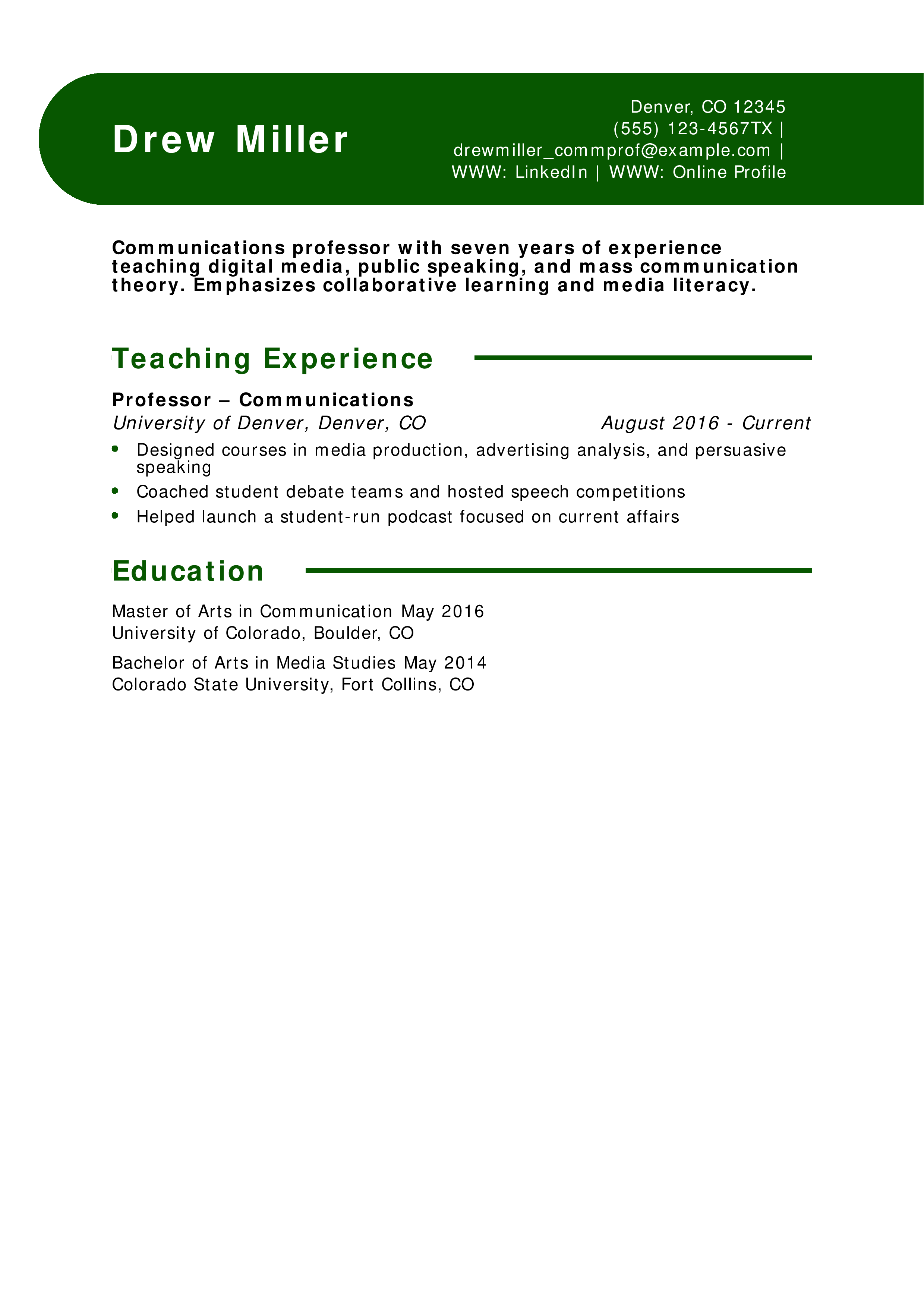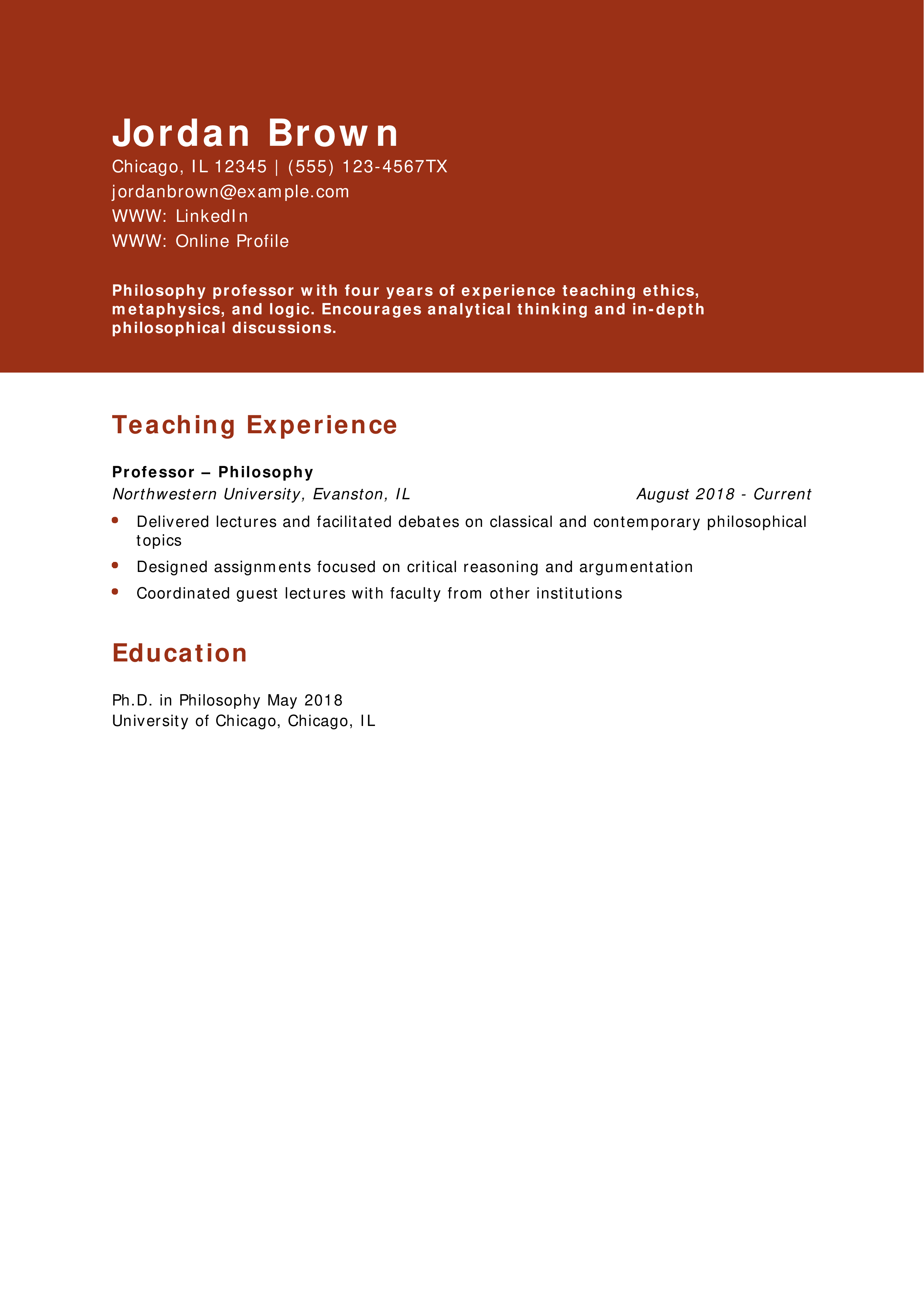 The combination format, also known as the hybrid format, is often a solid choice for professors for several reasons. It balances experience and skills, emphasizes teaching and academic achievements, and provides a comprehensive view of a professor’s qualifications. This lets you include relevant information about your teaching philosophy, awards, conference presentations, committee involvement, and work history.