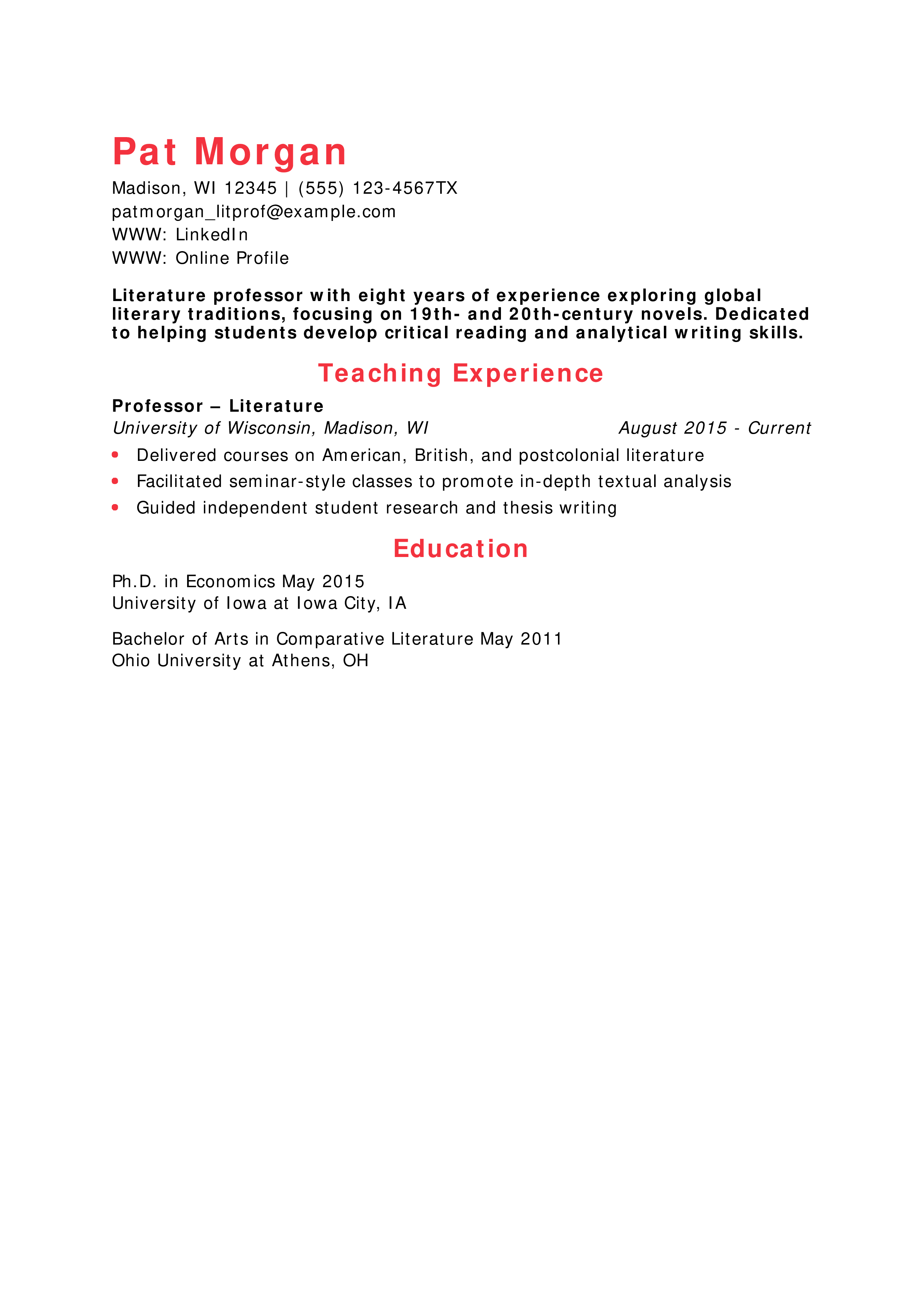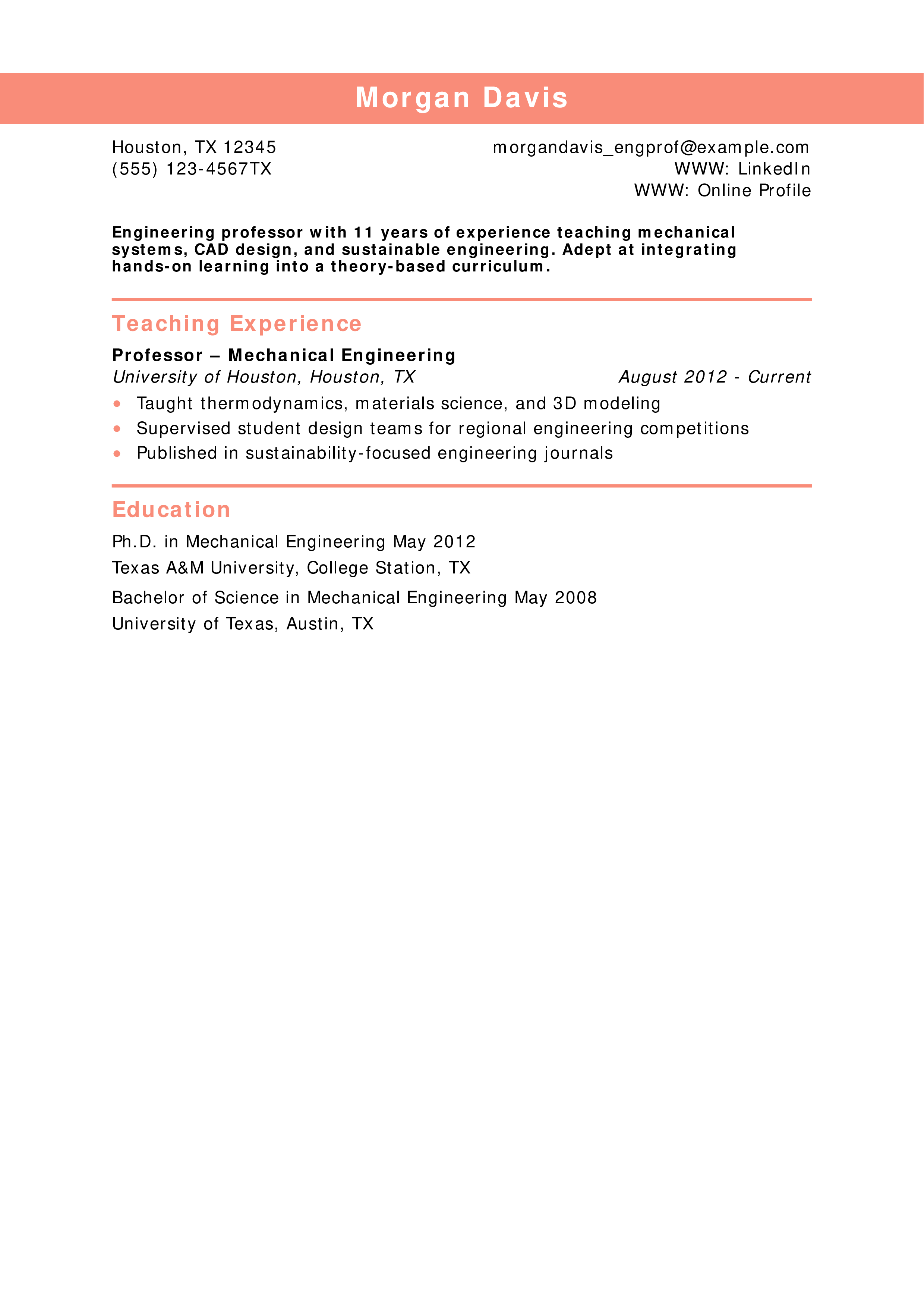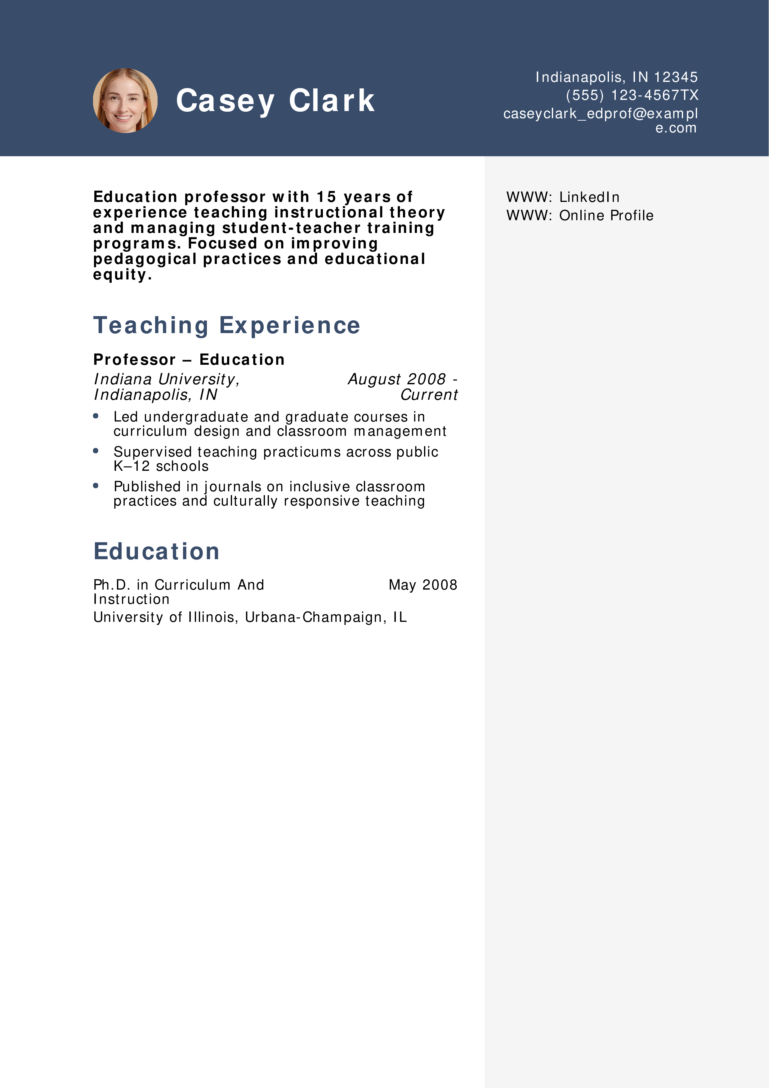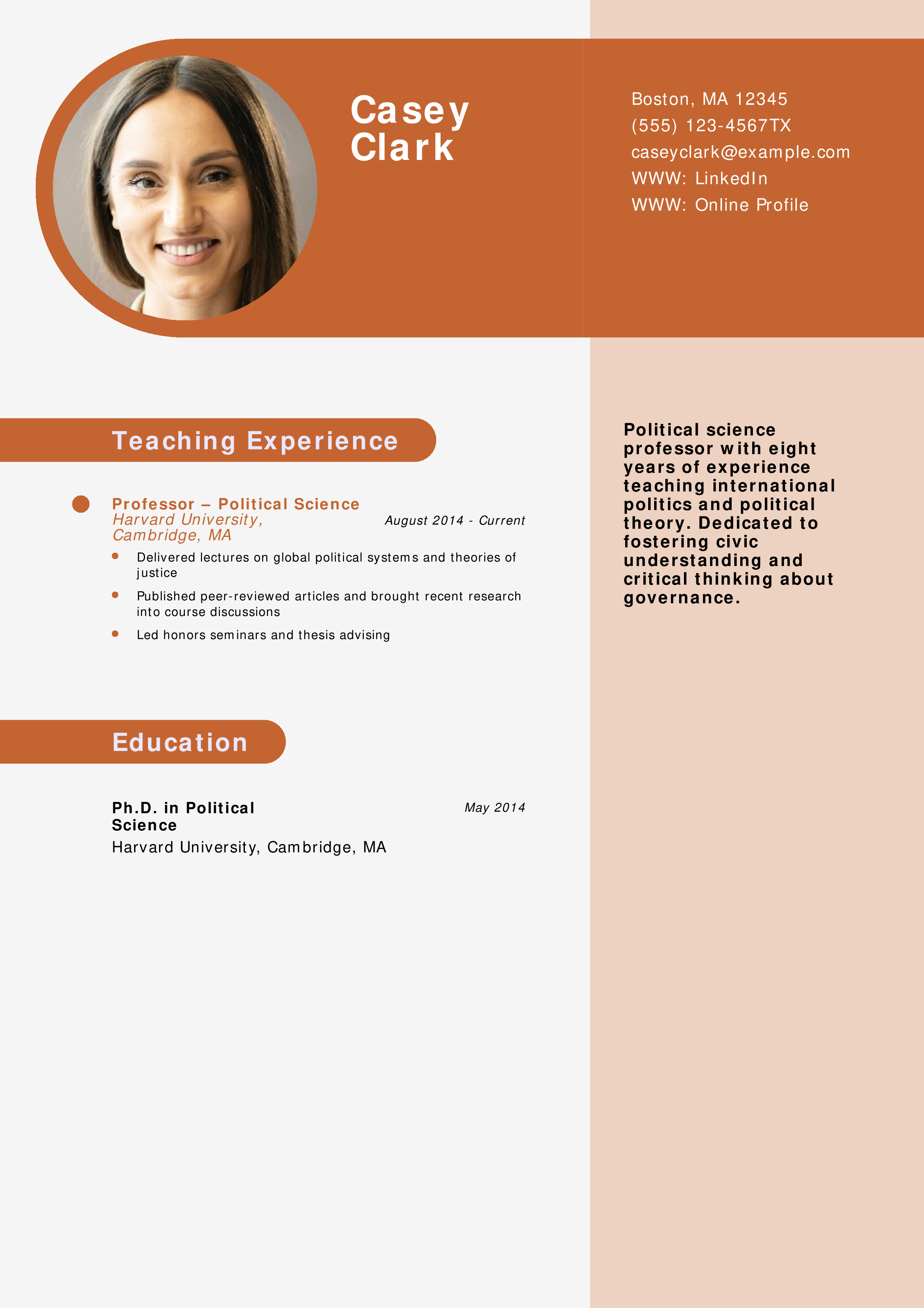 For professors, a clear and straightforward CV template is usually best. Opt for a layout that lets the hiring manager quickly review your best career details. Select a traditional font style, and avoid any template with a colorful or elaborate design.