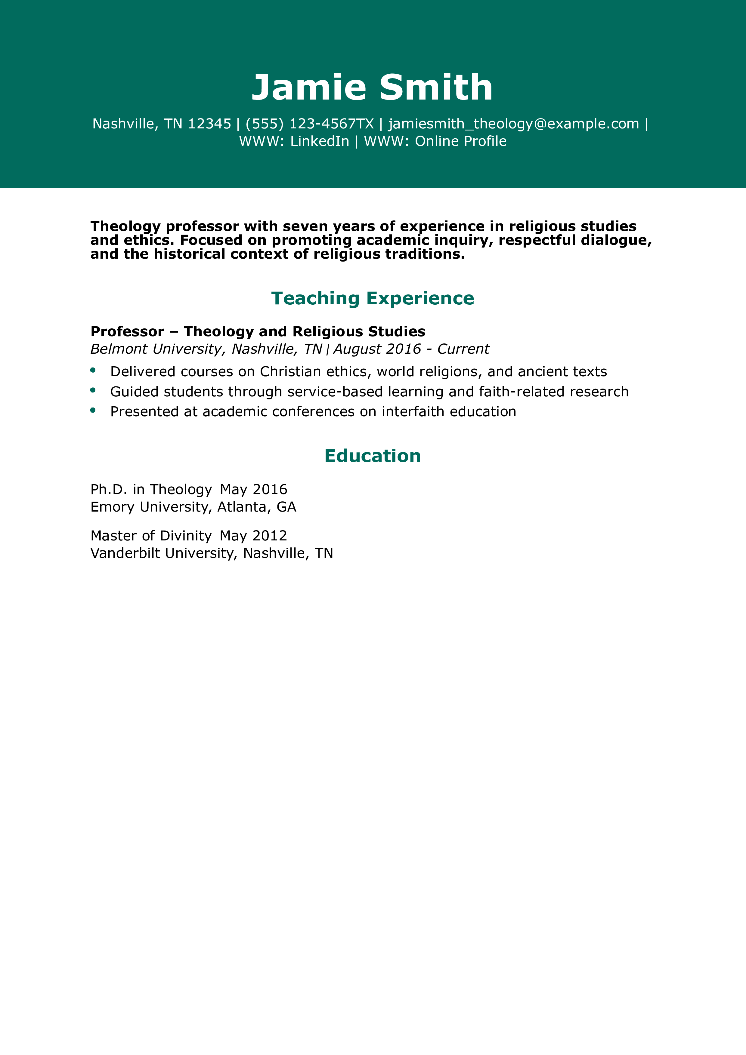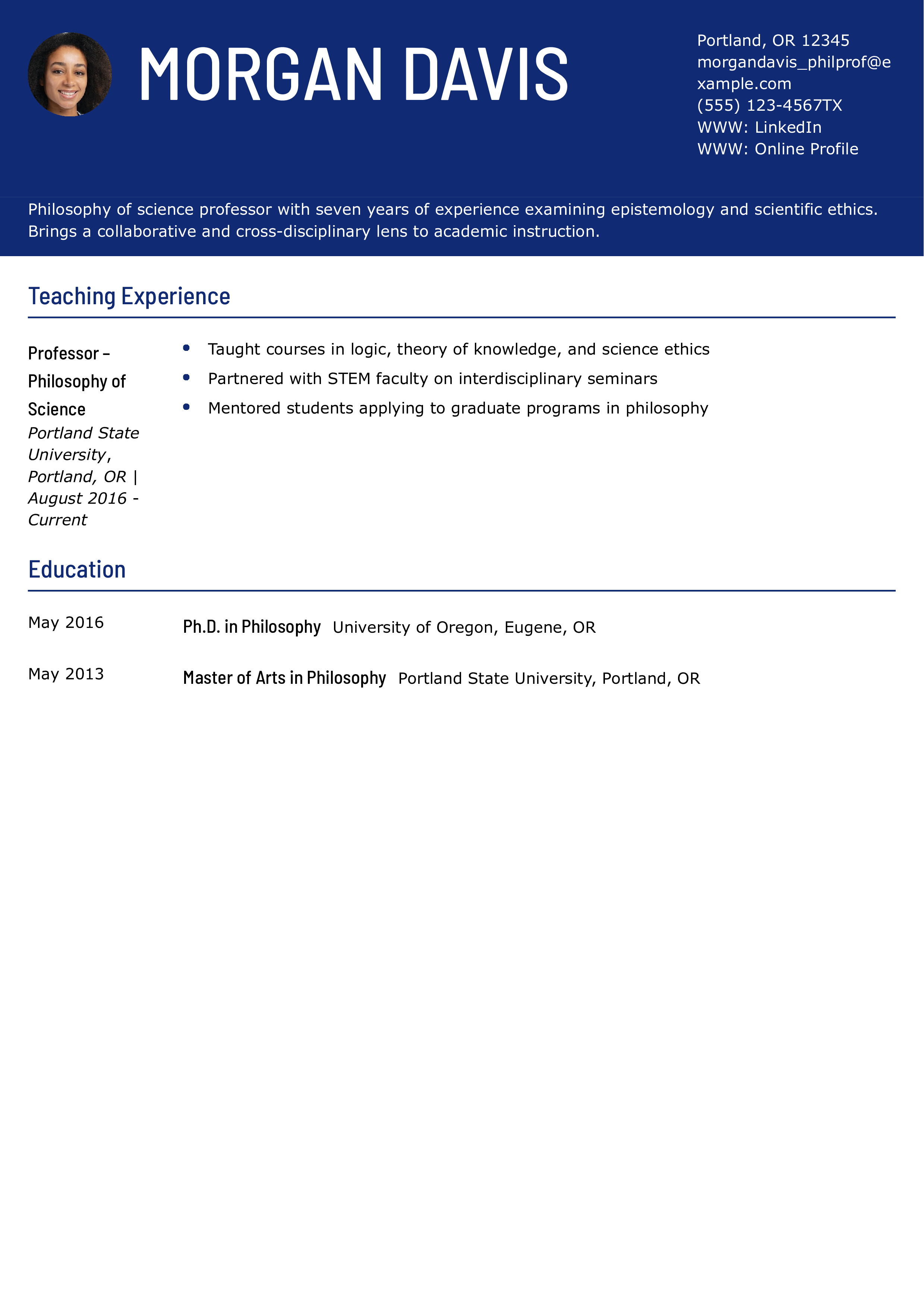 This resume is effective because it emphasizes scholarly research and compassionate education. For help making your experience impactful, visit how to make a resume.