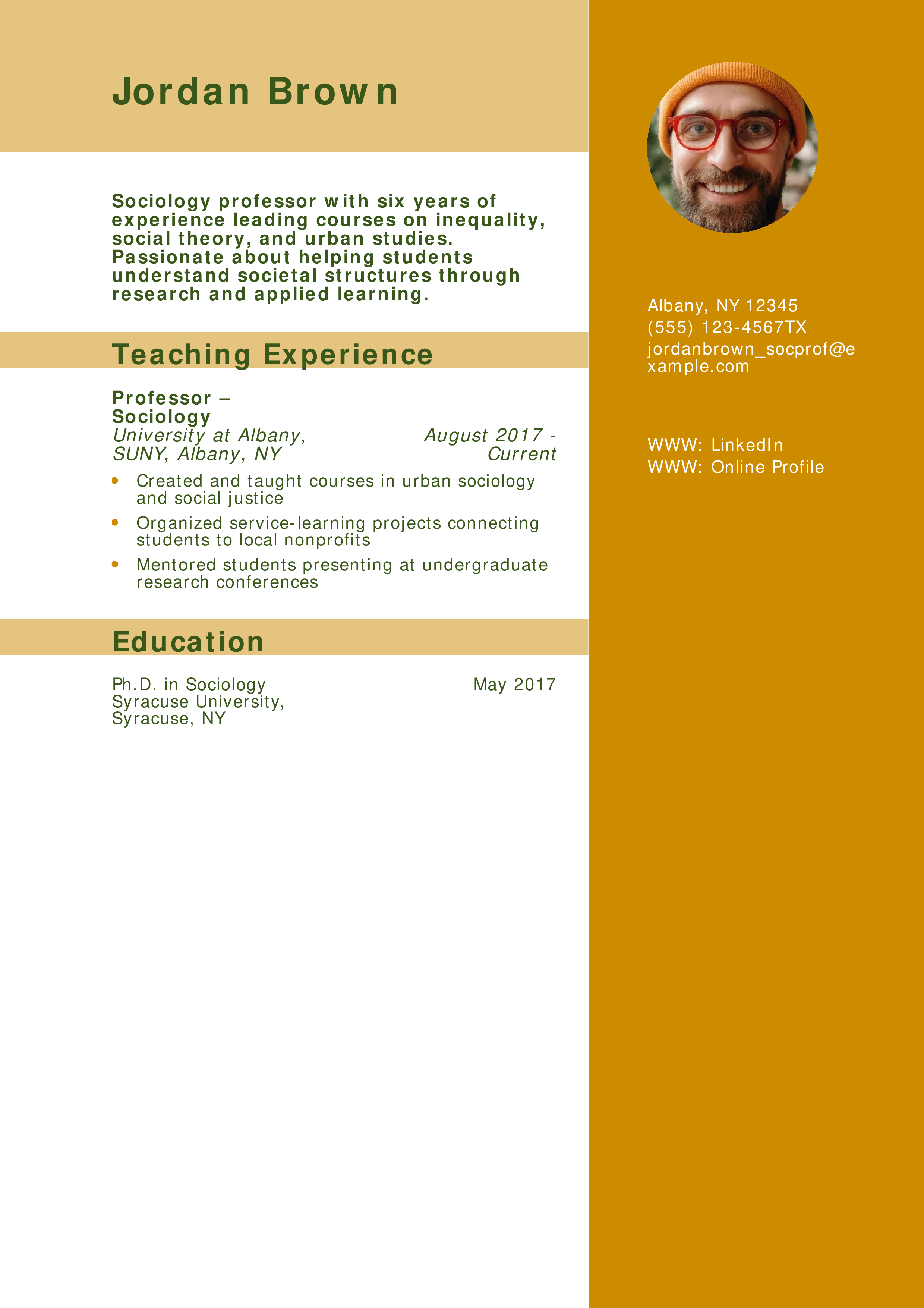 This resume is strong because it shows how community engagement makes academic topics relevant. Learn how to include volunteer-related teaching in your experience at how to put volunteer work on a resume.
