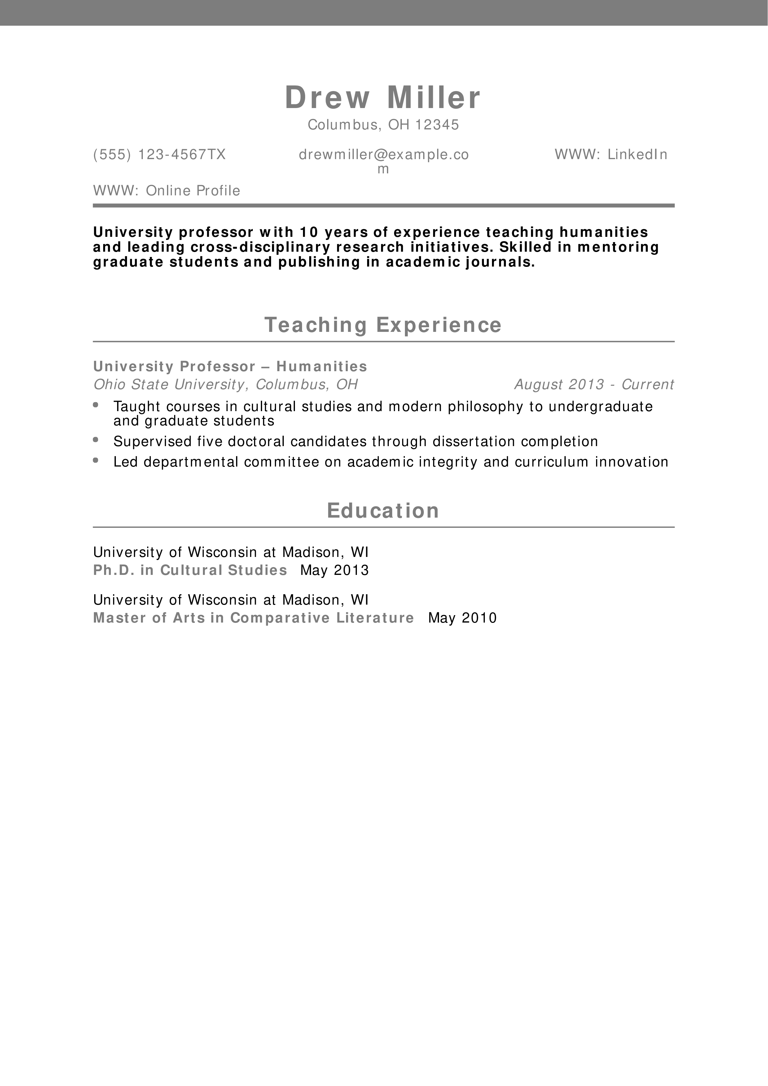 This resume is effective because it balances research productivity with service and teaching. For advice on presenting academic credentials clearly, visit cv vs. resume.