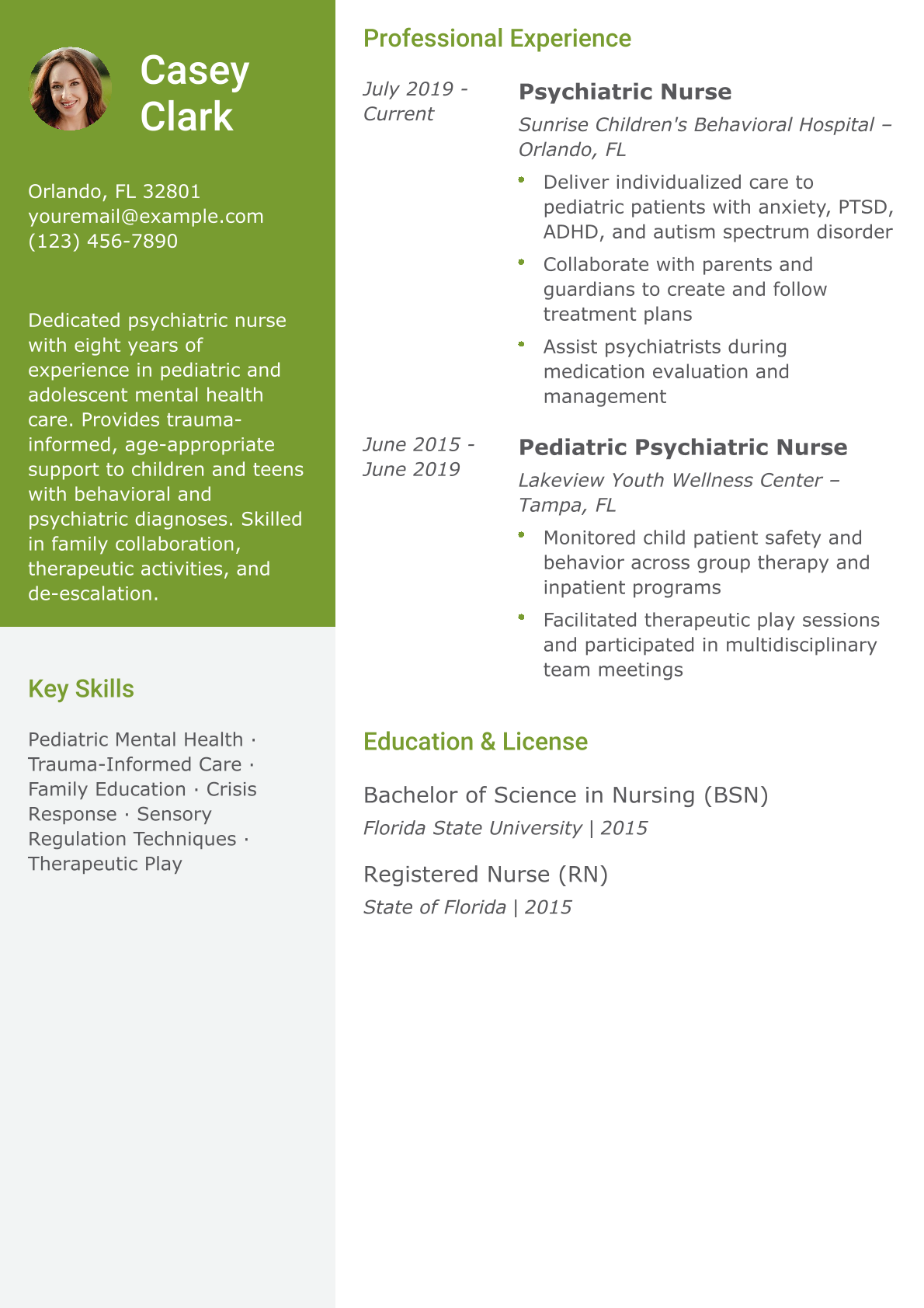 This resume is good because it tailors the psychiatric nurse role specifically to a pediatric audience. It showcases both clinical care and family communication skills and reflects an understanding of age-specific interventions.