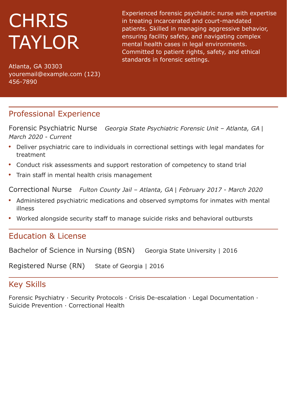 This resume is good because it showcases the nurse’s specialized knowledge in forensic psychiatric care and outlines their experience working in legally sensitive environments. It also highlights essential safety and documentation skills.