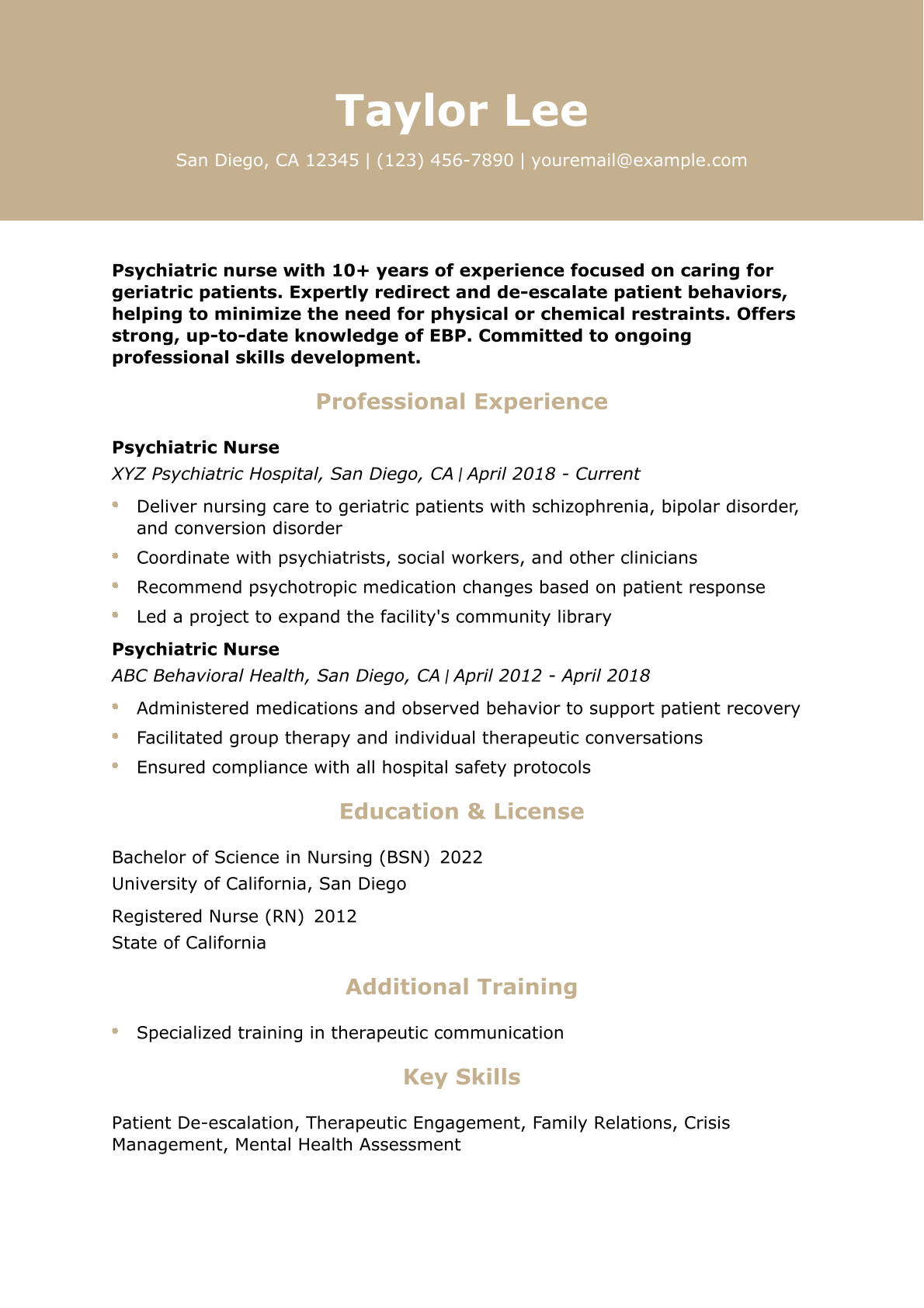 Psychiatric Nurse, XYZ Psychiatric Hospital, San Diego, CA