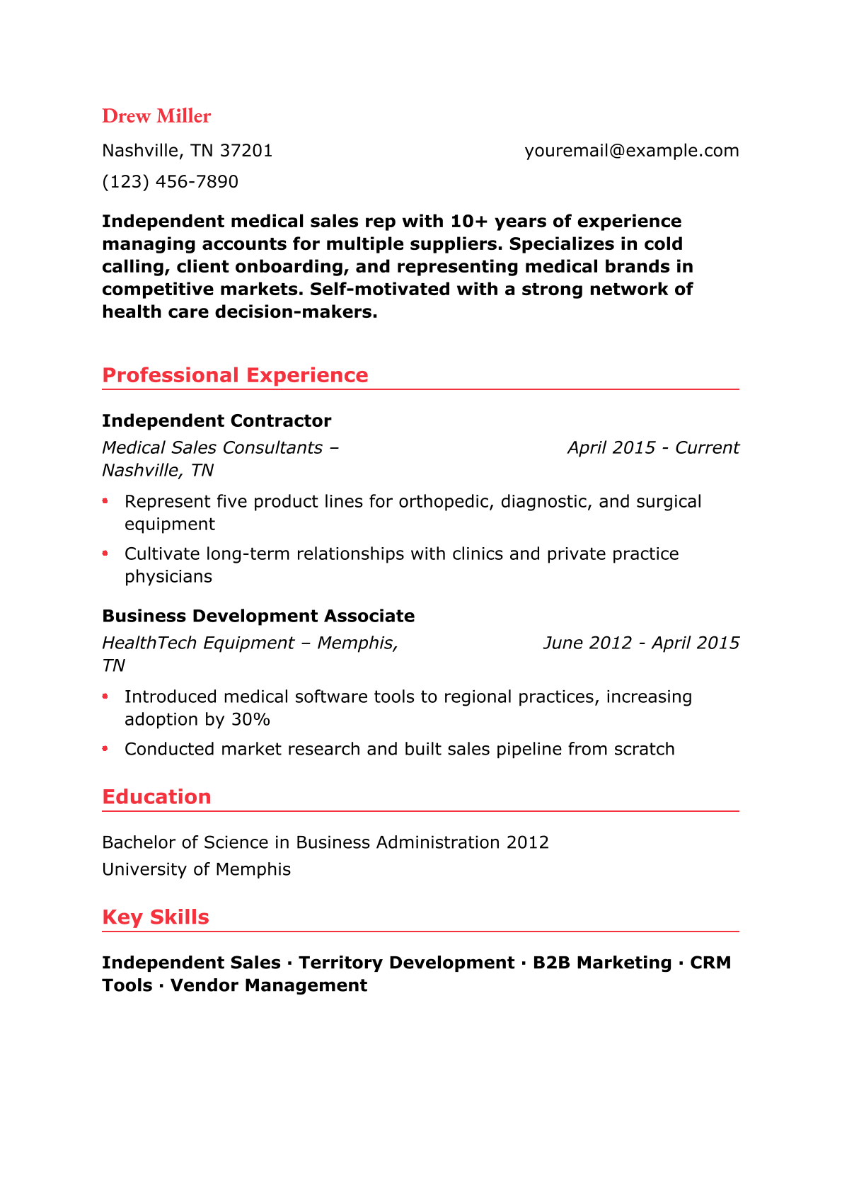 Independent Medical Sales Representative Resume Example
