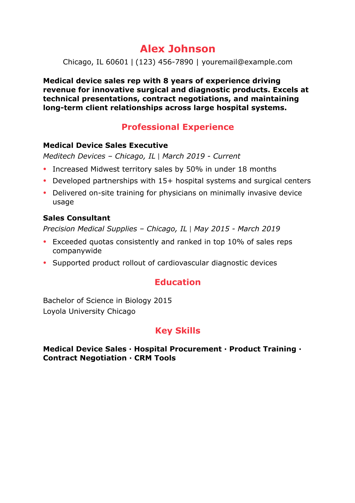 Medical Device Sales Representative Resume Example