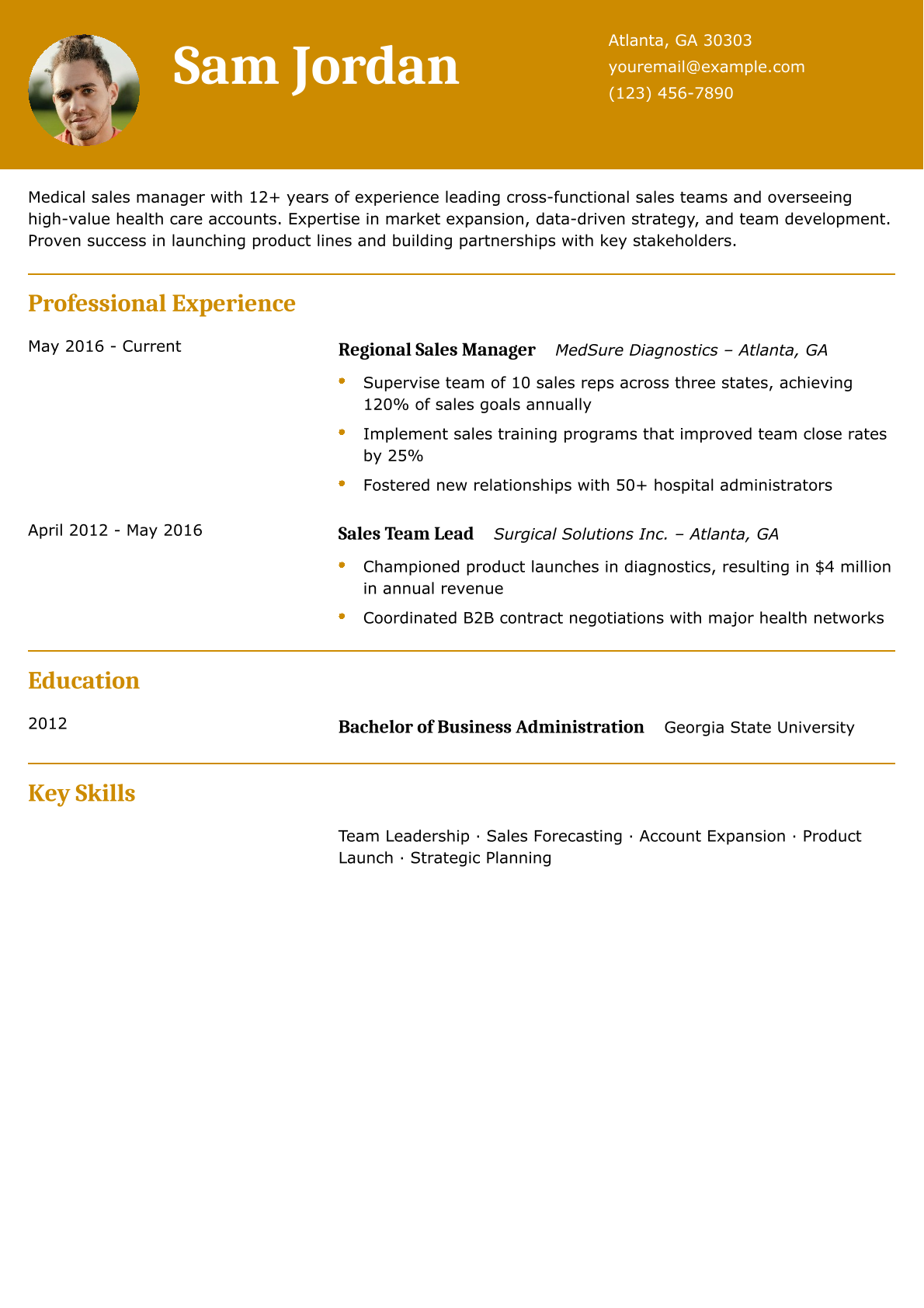 Medical Sales Manager Resume Example