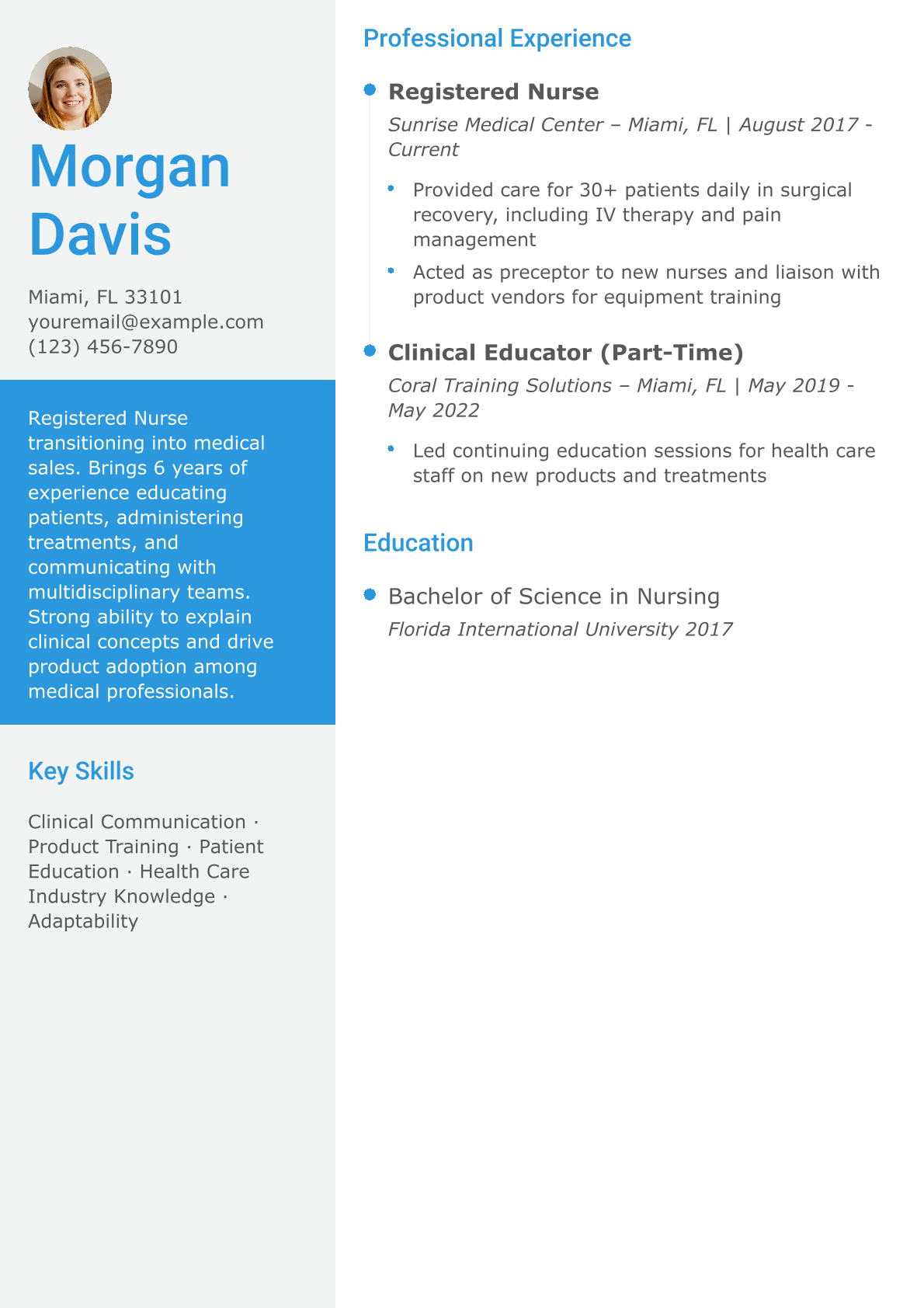 This resume highlights transferable skills from nursing — like patient communication and product knowledge — critical for success in medical sales.