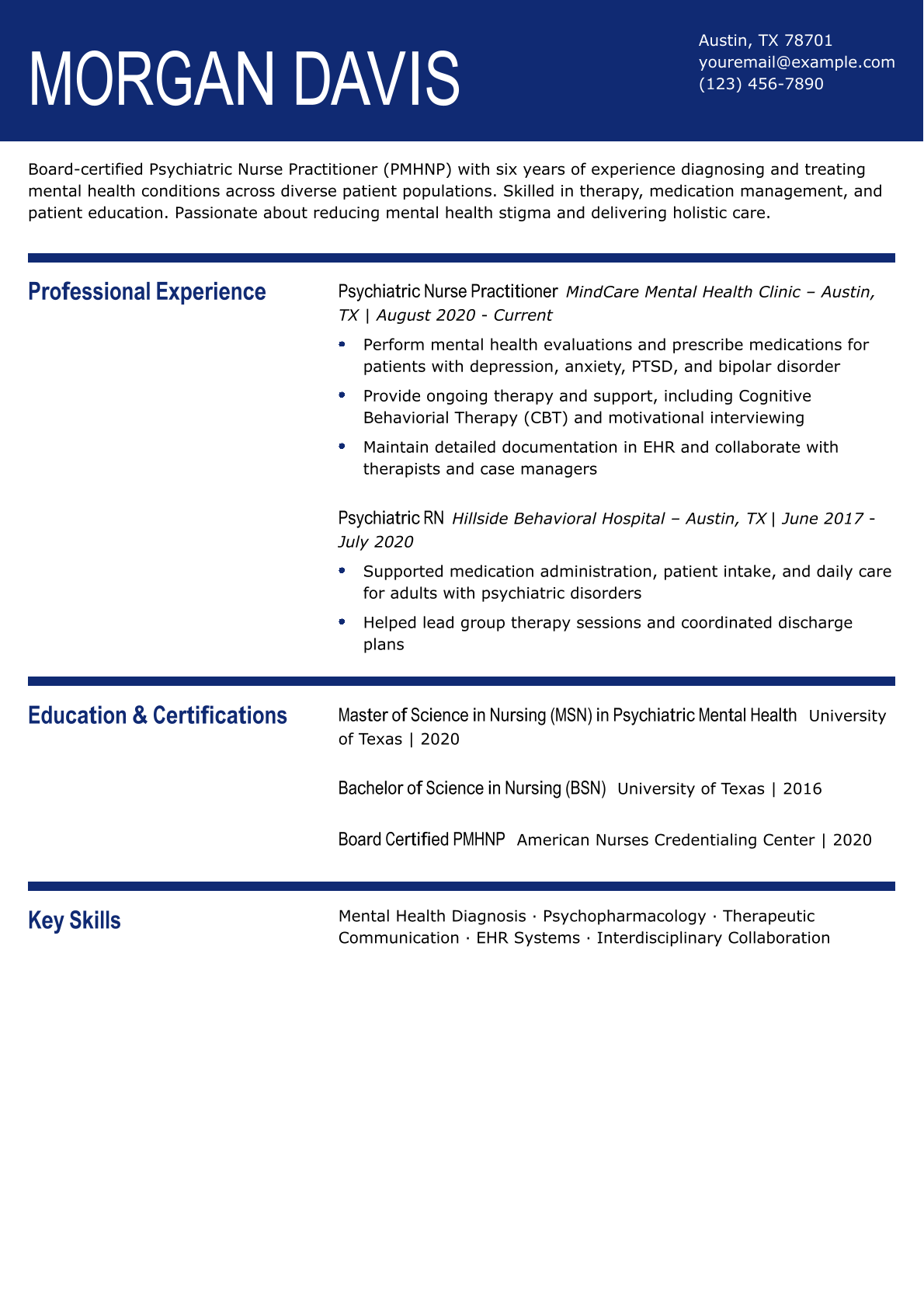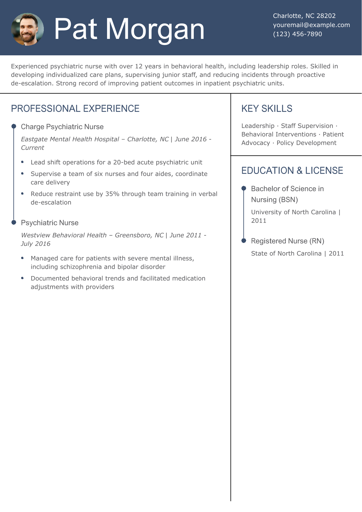 Psychiatric nurses should use a resume to present their strong blend of communication skills and medical expertise. A great way to capture these details is to add a “Key Skills” section just below your profile paragraph.