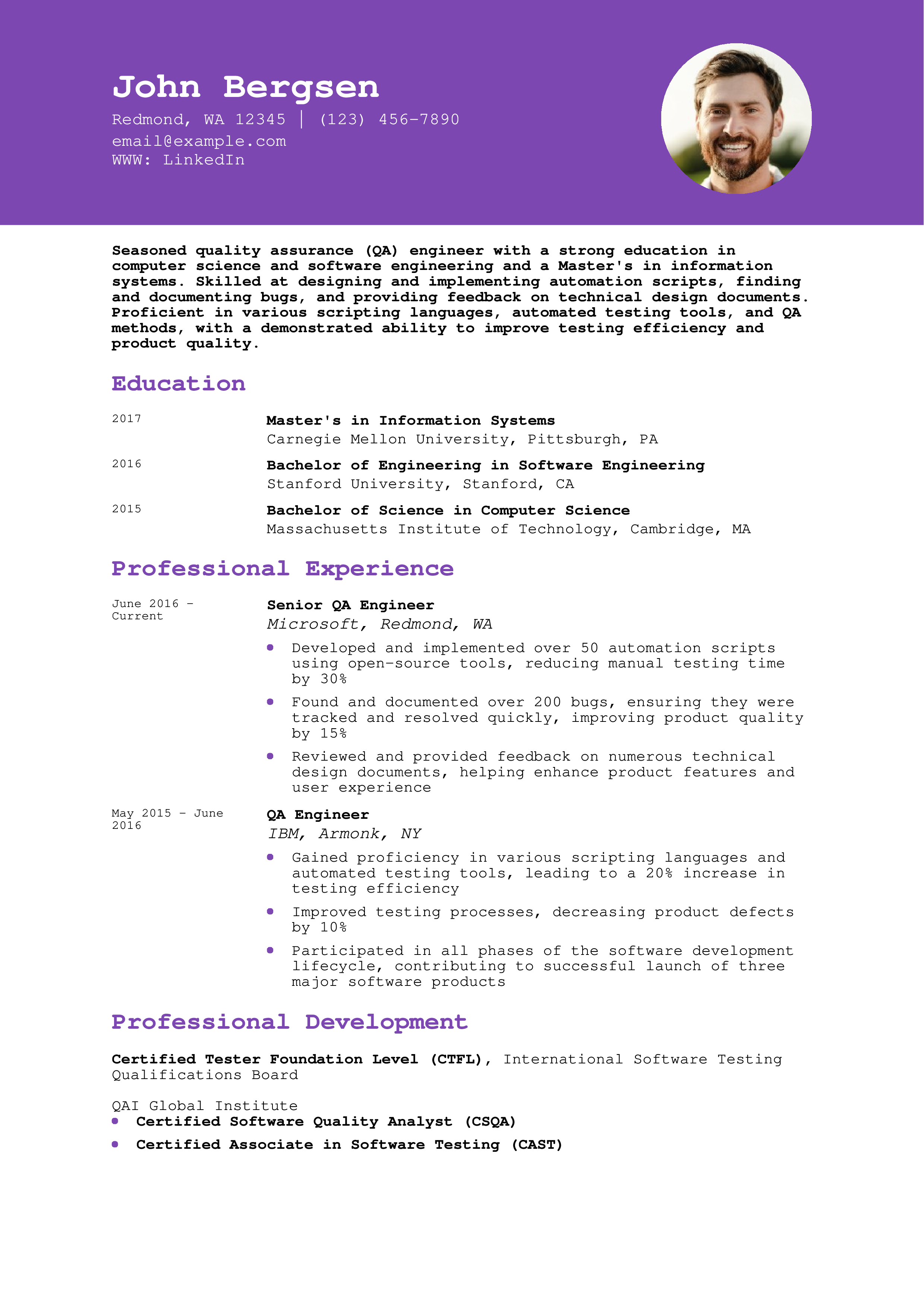For example, if you implemented a new quality assurance review process, emphasize how this procedure reduced product defects and improved reliability. If you identified opportunities to automate manual testing, you might showcase a noticeable reduction in work hours or product deployment times.