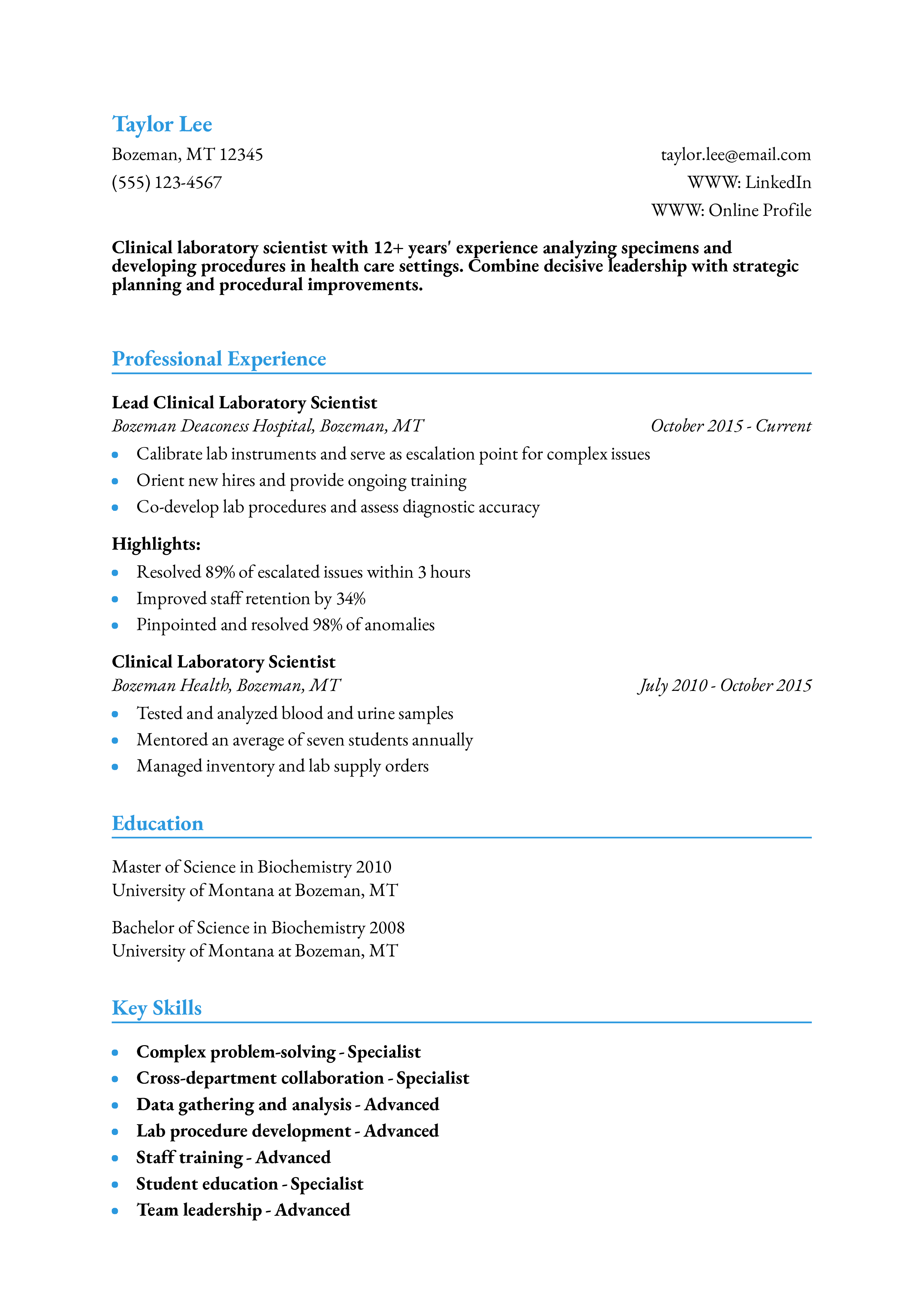 Clinical laboratory scientist with over 12 years’ experience analyzing specimens and developing procedures in health care settings. Combine decisive, supportive leadership style with a talent for strategic planning and deployment. Master of Science in Biochemistry.
