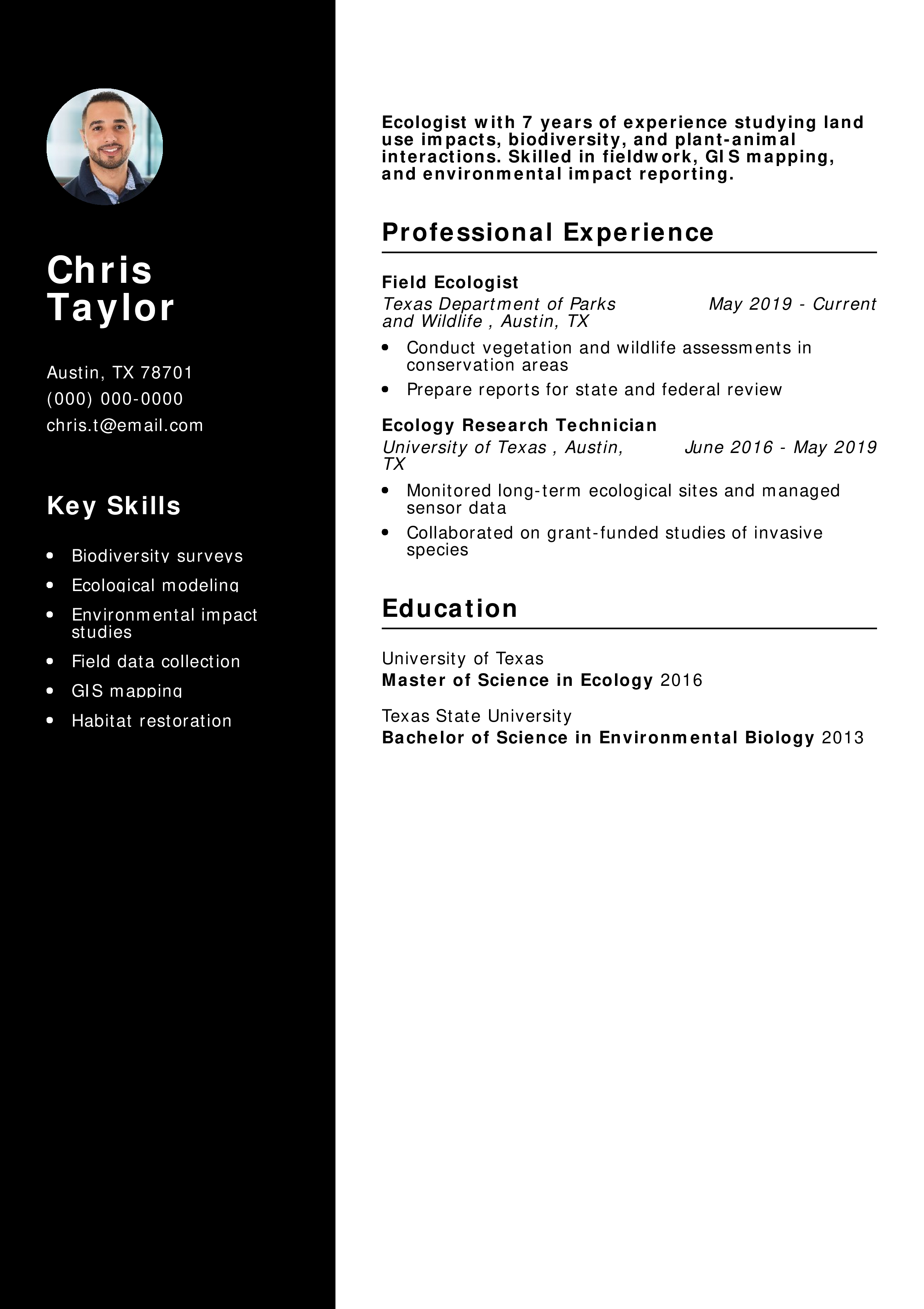 This resume is good because it highlights field experience and scientific reporting, essential in government and academic ecology roles.