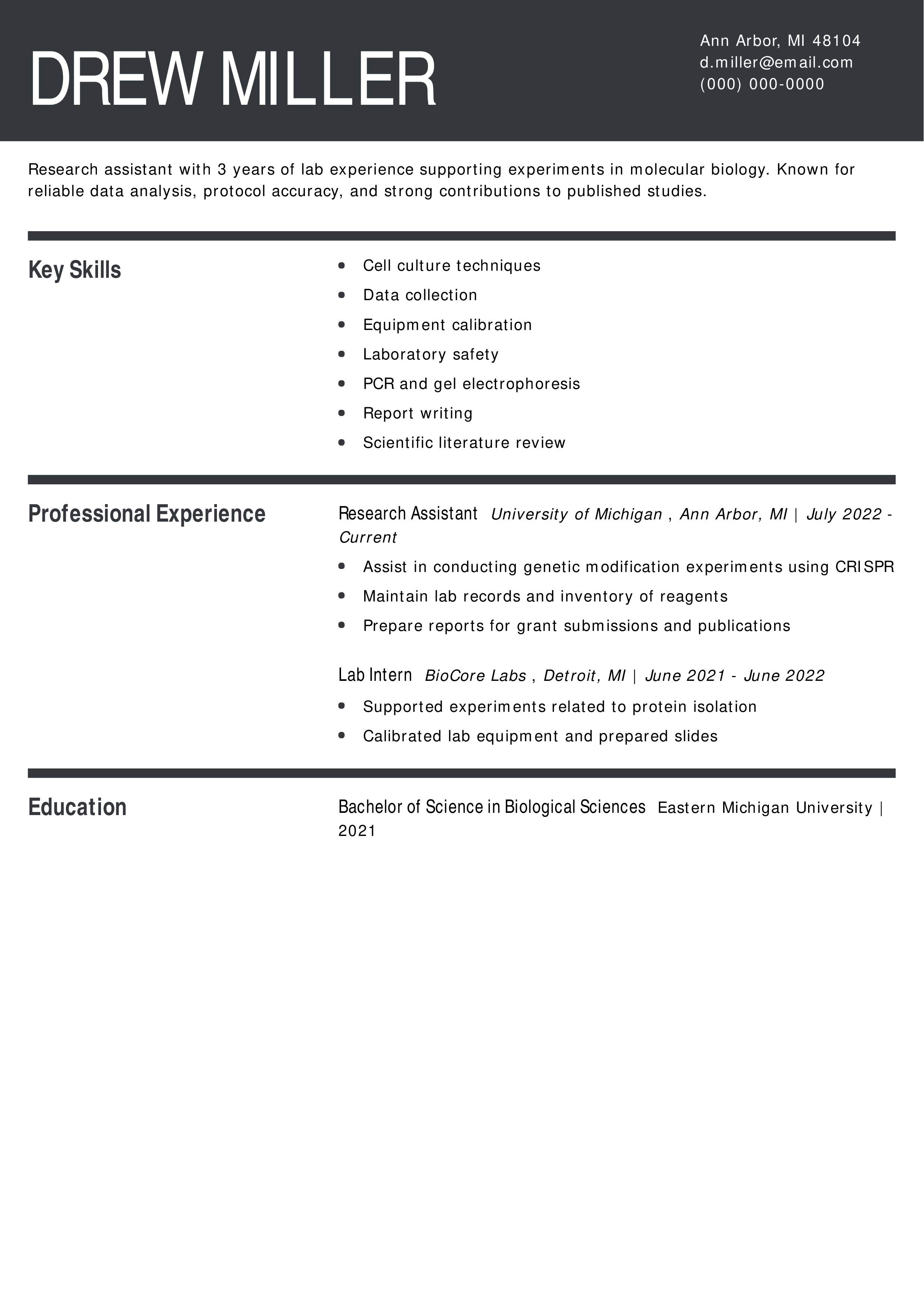 This resume is good because it focuses on core lab skills and university research, which helps early-career candidates compete for lab technician and grad school roles.