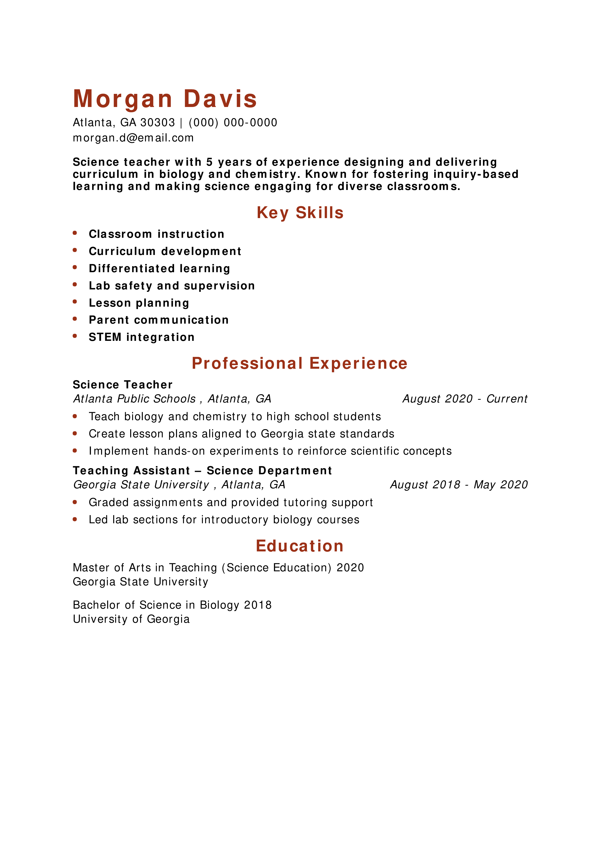 Science Teacher Resume