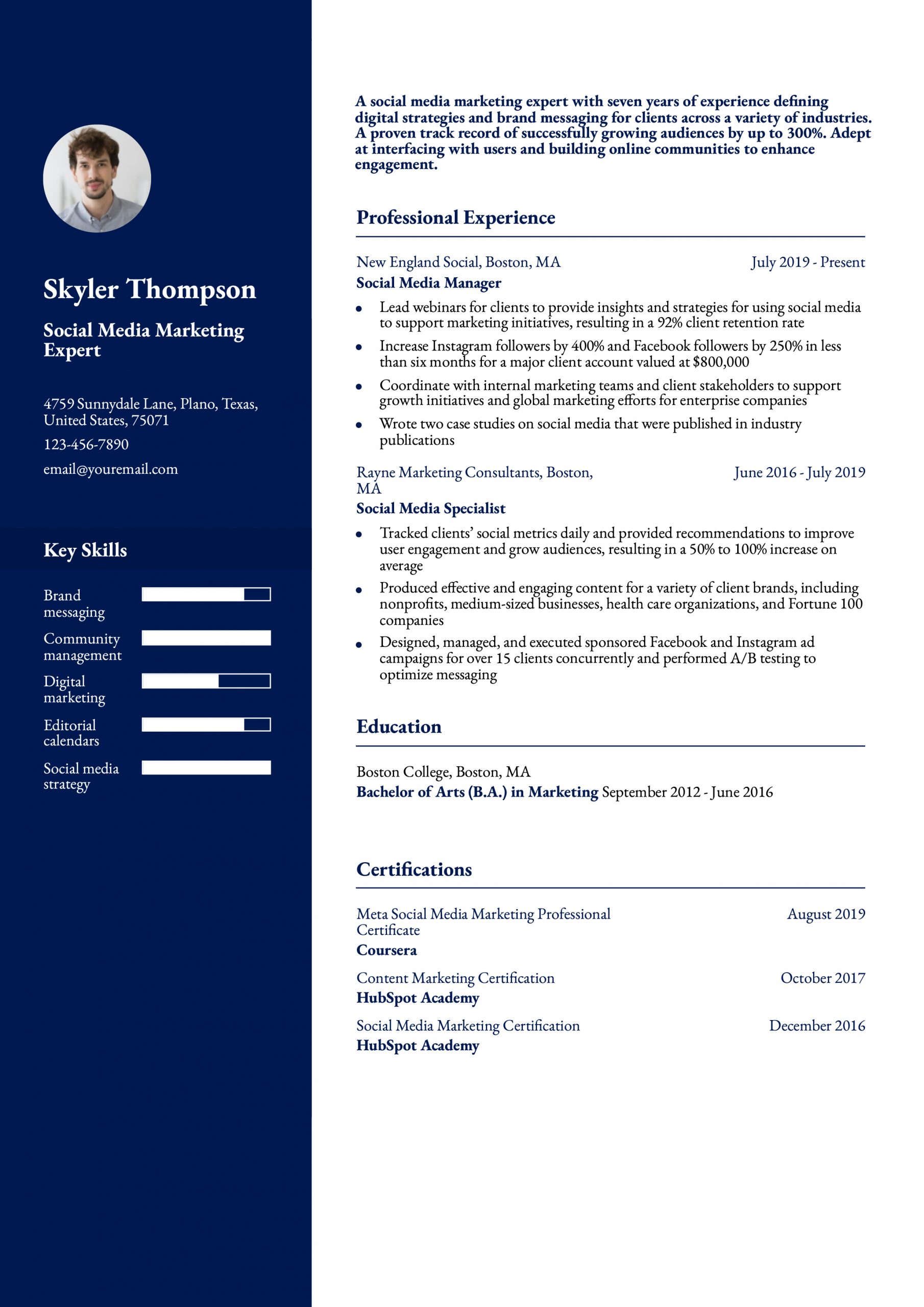 Social media is a vital component of digital marketing campaigns, and companies need skilled strategists to reach target audiences on social platforms. Despite the large number of opportunities available, you’ll need to market yourself effectively to prospective employers, mentioning your skills in copywriting, digital marketing, brand messaging, and more. The best way to accomplish this is by crafting a results-driven resume that highlights the strongest aspects of your social media background. We’ll provide valuable insights to help translate your experience into an impactful marketing document.
