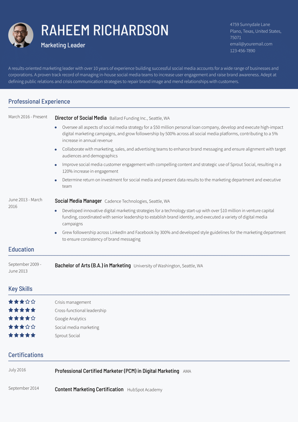 As a social media marketing professional, consider selecting a template that has more visual appeal. That being said, ensure the aesthetics of the template won’t distract the reader from your qualifications and career achievements. Seek a healthy balance that emphasizes your creativity without compromising the integrity of your document.