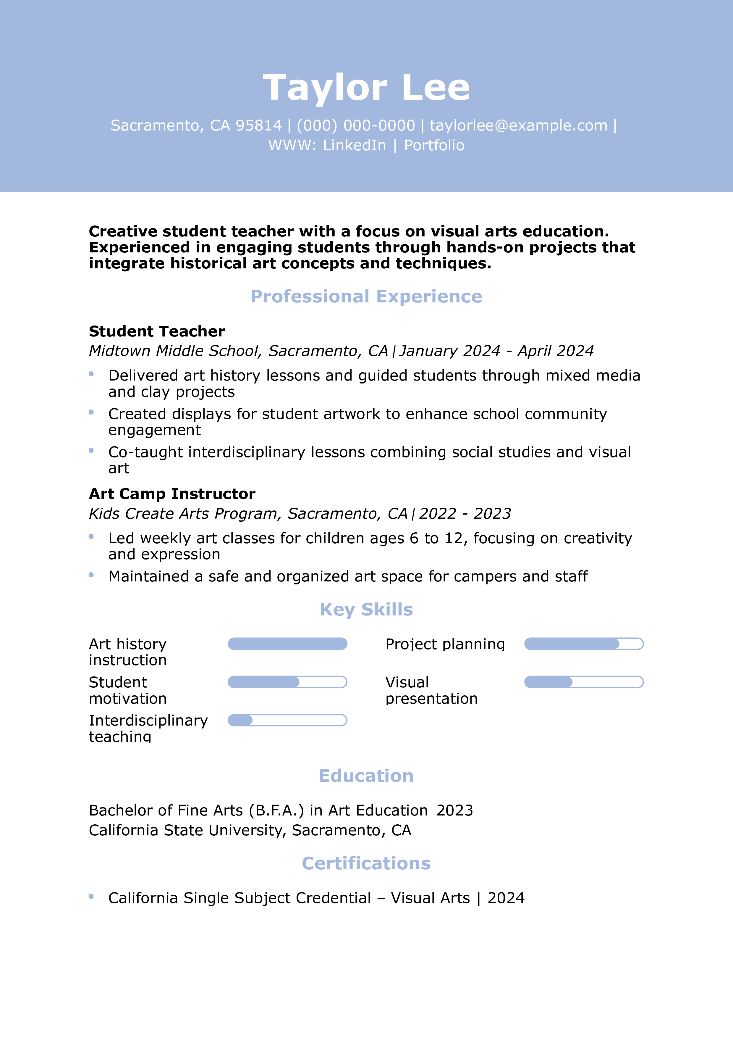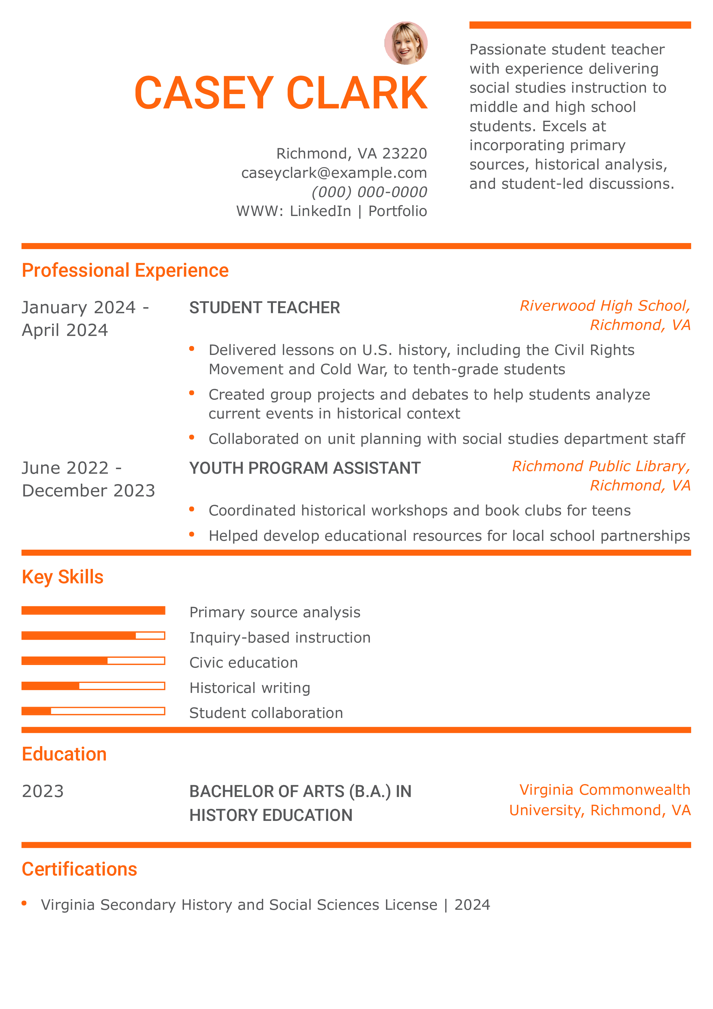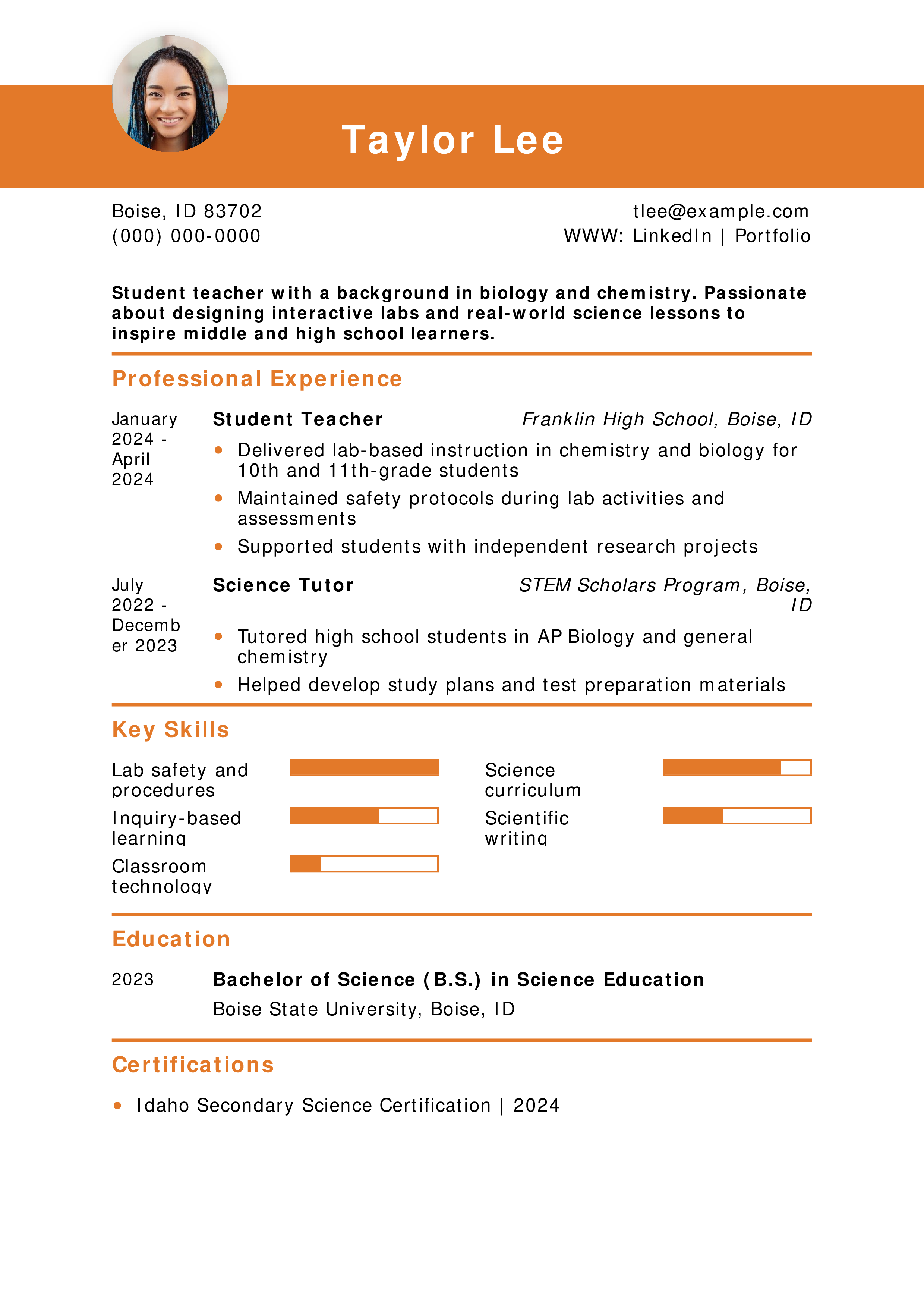 The reverse chronological approach is typically best for student teachers. Although you’re still in the early stages of your education career, it’s best to highlight the experiences you’ve gained during your student teacher program ahead of your skills. A combination format can be a viable option if you lack experience in the classroom.