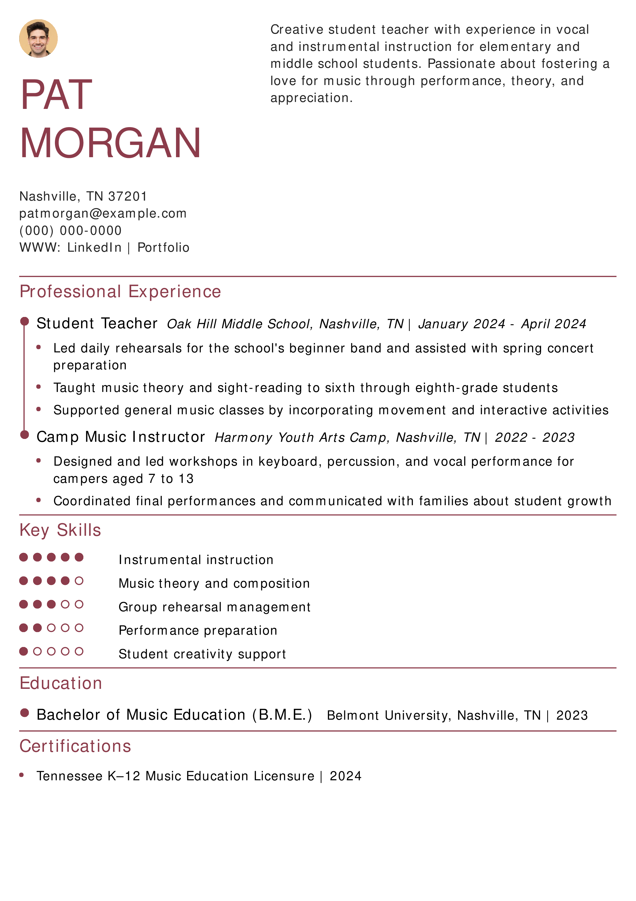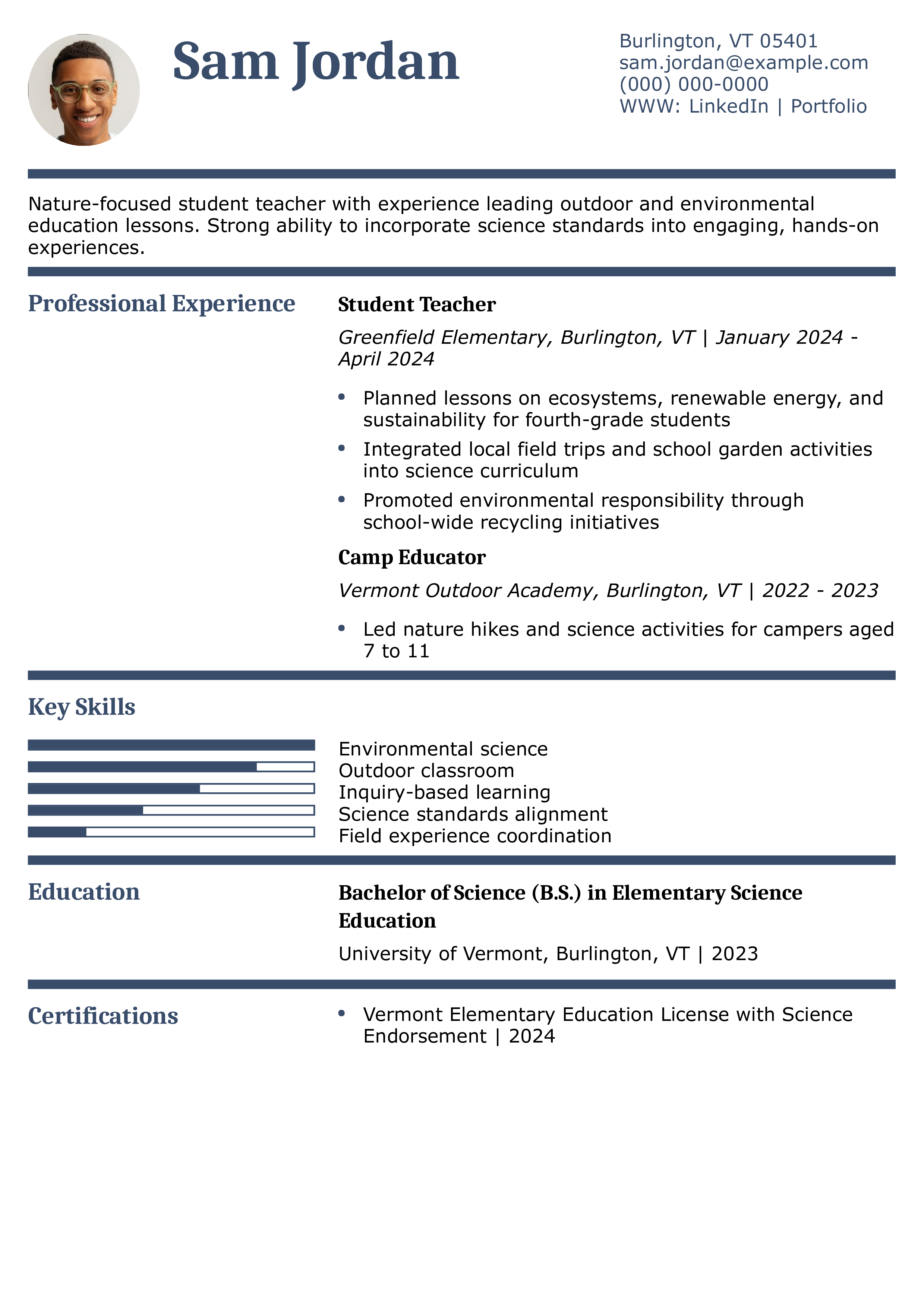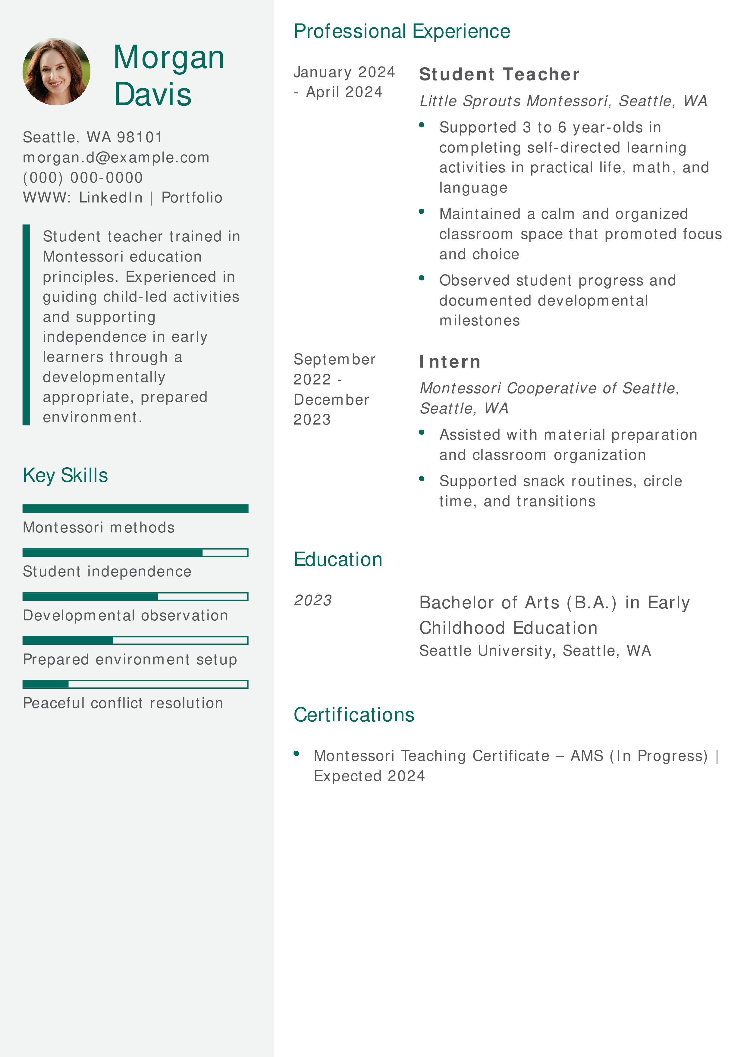 The reverse chronological approach is typically best for student teachers. Although you’re still in the early stages of your education career, it’s best to highlight the experiences you’ve gained during your student teacher program ahead of your skills. A combination format can be a viable option if you lack experience in the classroom.