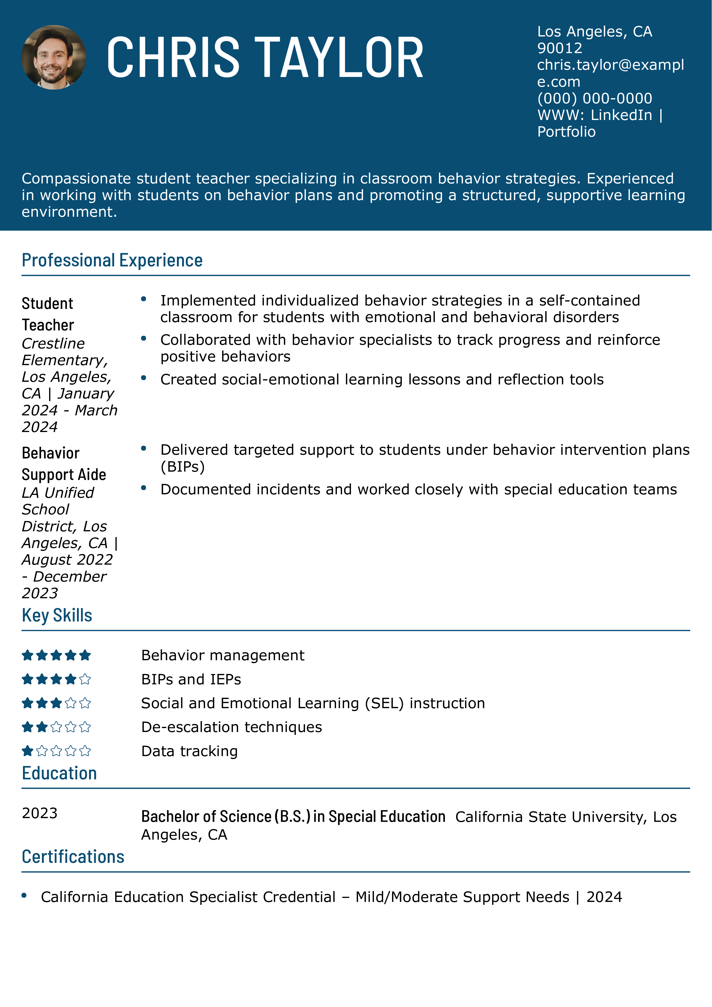 This resume highlights both instructional and behavioral intervention experience. It demonstrates the applicant’s ability to handle high-need classroom settings. Learn how to format your resume for clarity using Best Resume Formats.