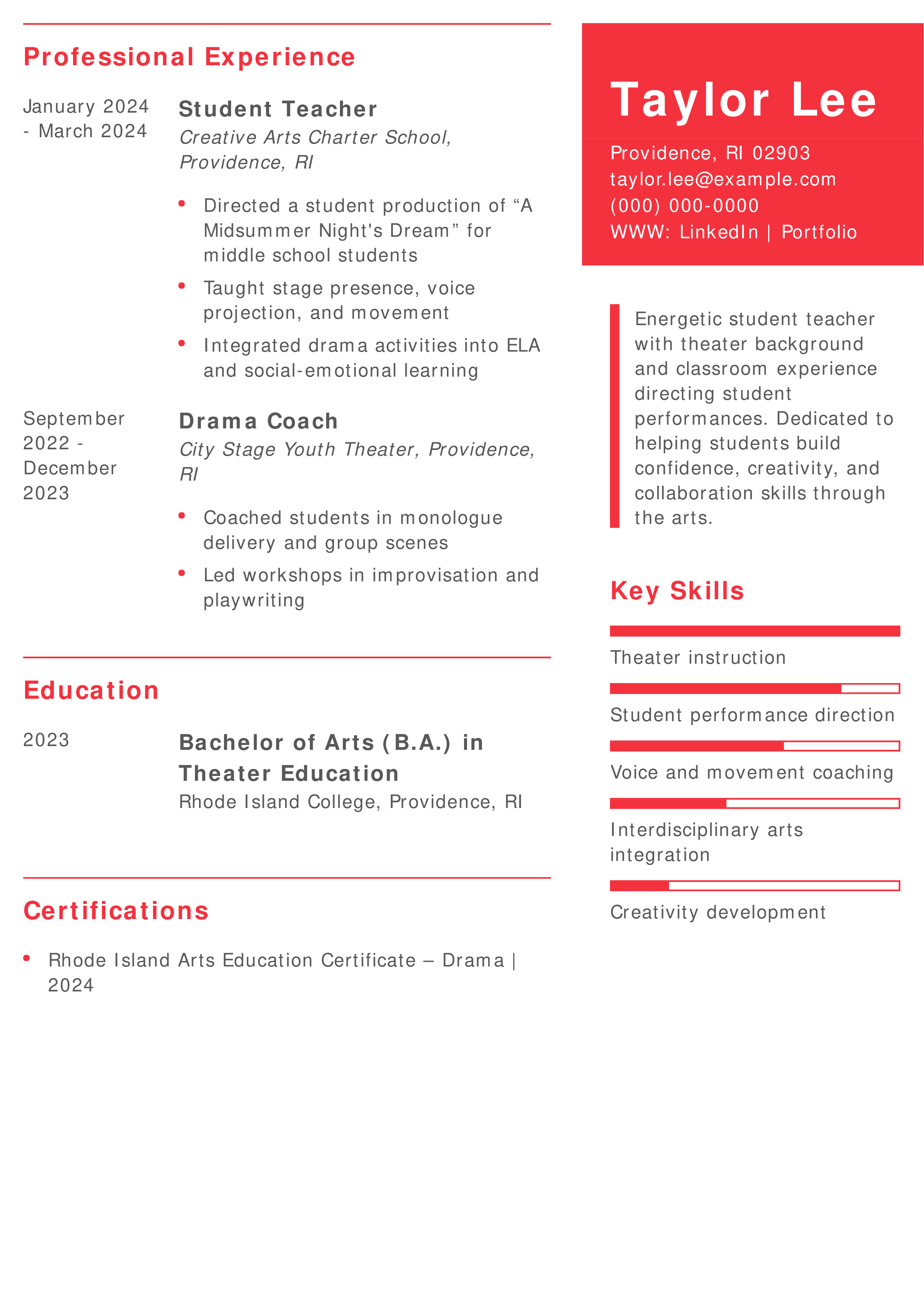 This resume clearly focuses on arts education and provides tangible outcomes like student performances. It demonstrates how creative instruction can build student confidence. For more ways to enhance your credentials, visit How To List Certifications on a Resume.