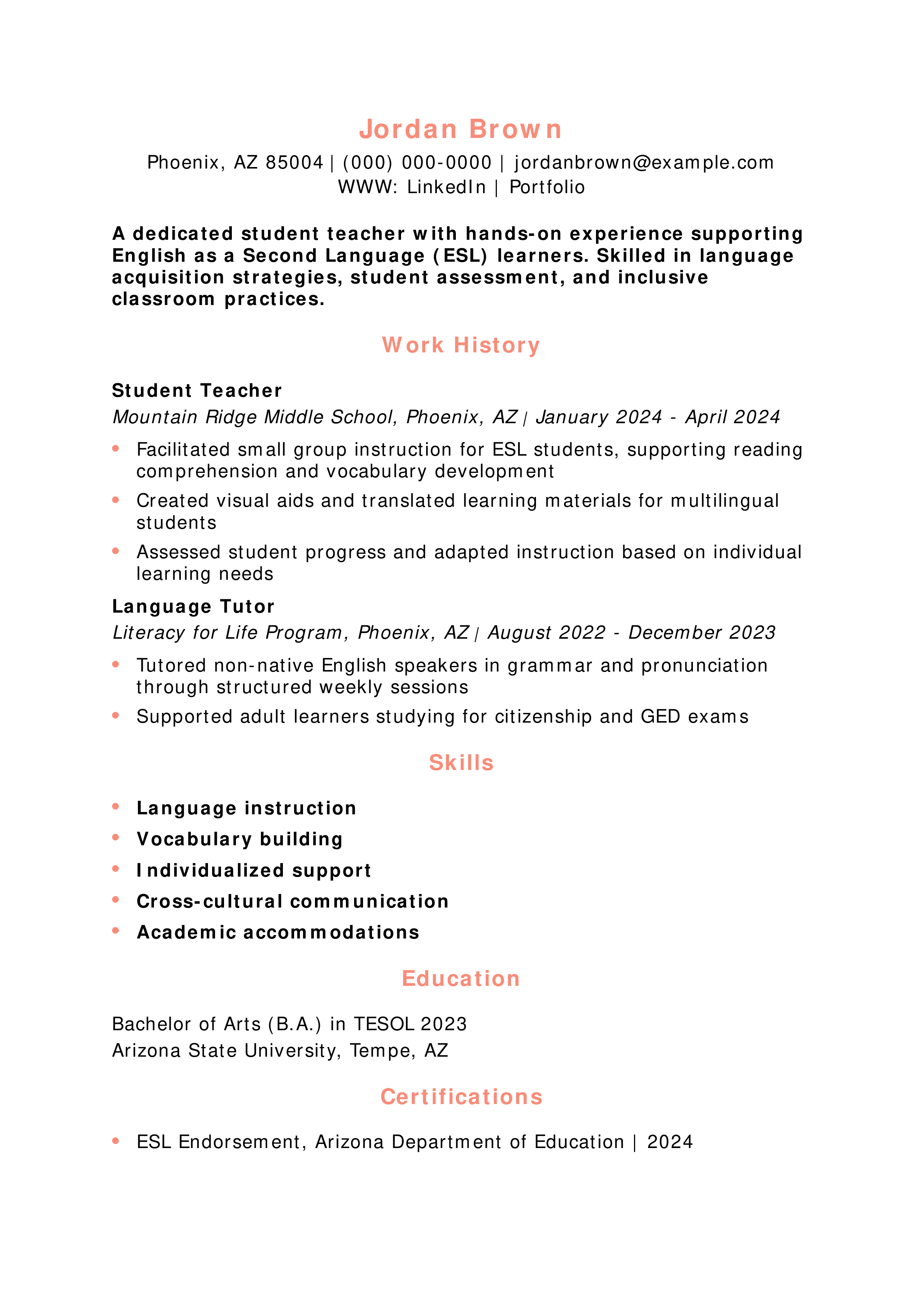 This resume shows how the candidate tailors instruction for diverse learners and demonstrates a commitment to accessibility and cultural awareness. For more ideas on how to list language skills and certifications, read How To List Certifications on a Resume.