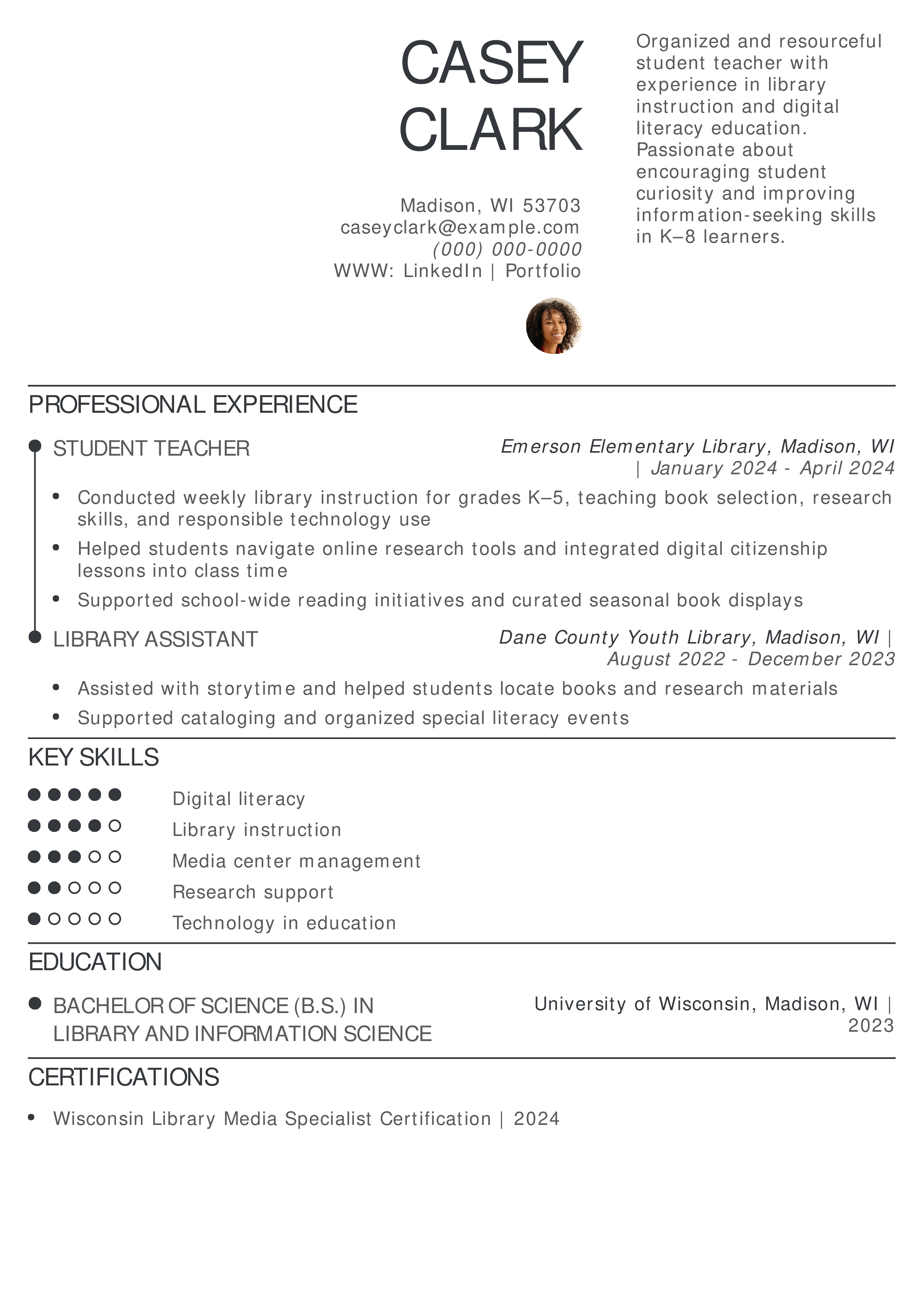 This resume highlights practical library experience and a strong foundation in technology integration. It's especially useful for candidates interested in media center or tech integration roles. Read more about aligning resumes with your goals at CV vs. Resume.