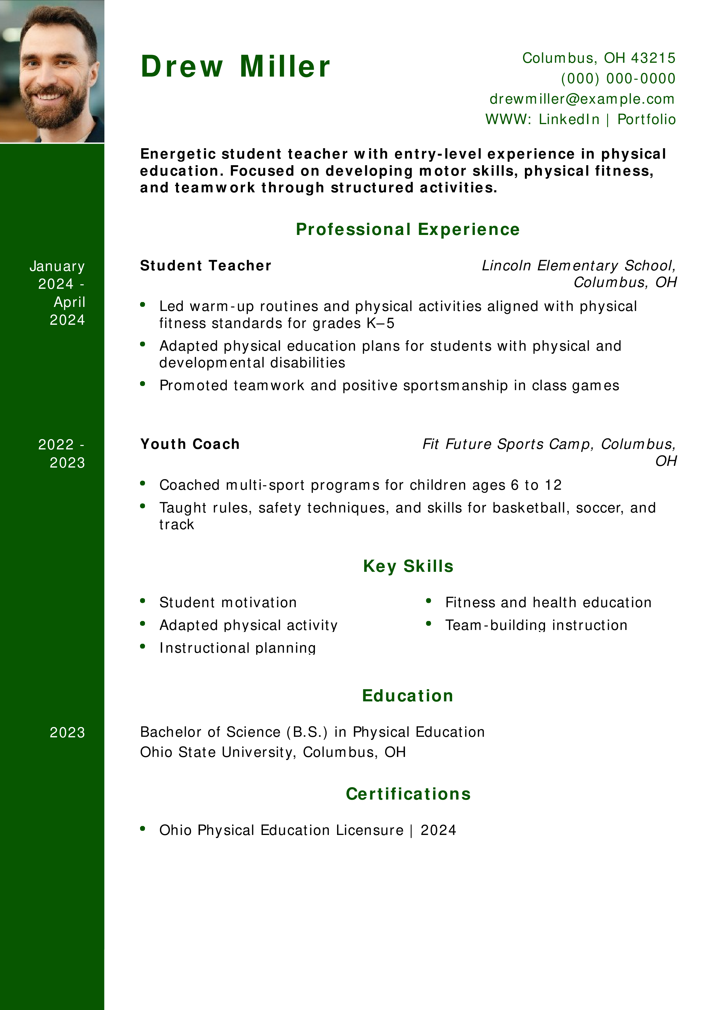 This resume stands out because it reflects the candidate’s ability to create inclusive and engaging physical education programs. It also demonstrates a commitment to promoting physical and social development. Learn how to refine your skills section with this resource: Resume Skills.