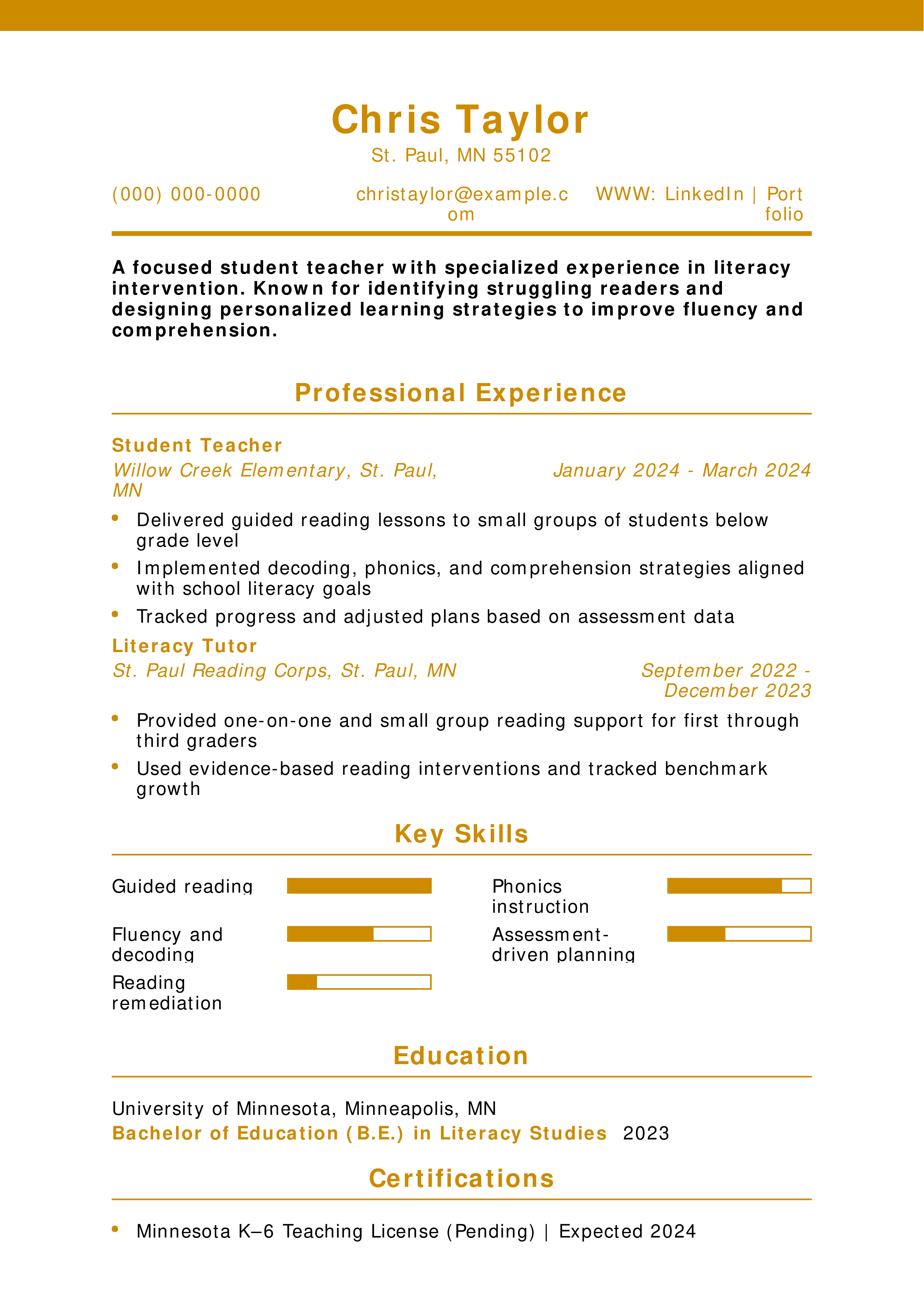 This resume clearly evidences the candidate’s experience with reading interventions and targeted instruction. Including data-driven strategies demonstrates their ability to improve student outcomes. To learn how to highlight education on your resume properly, check out How To List Your Education.
