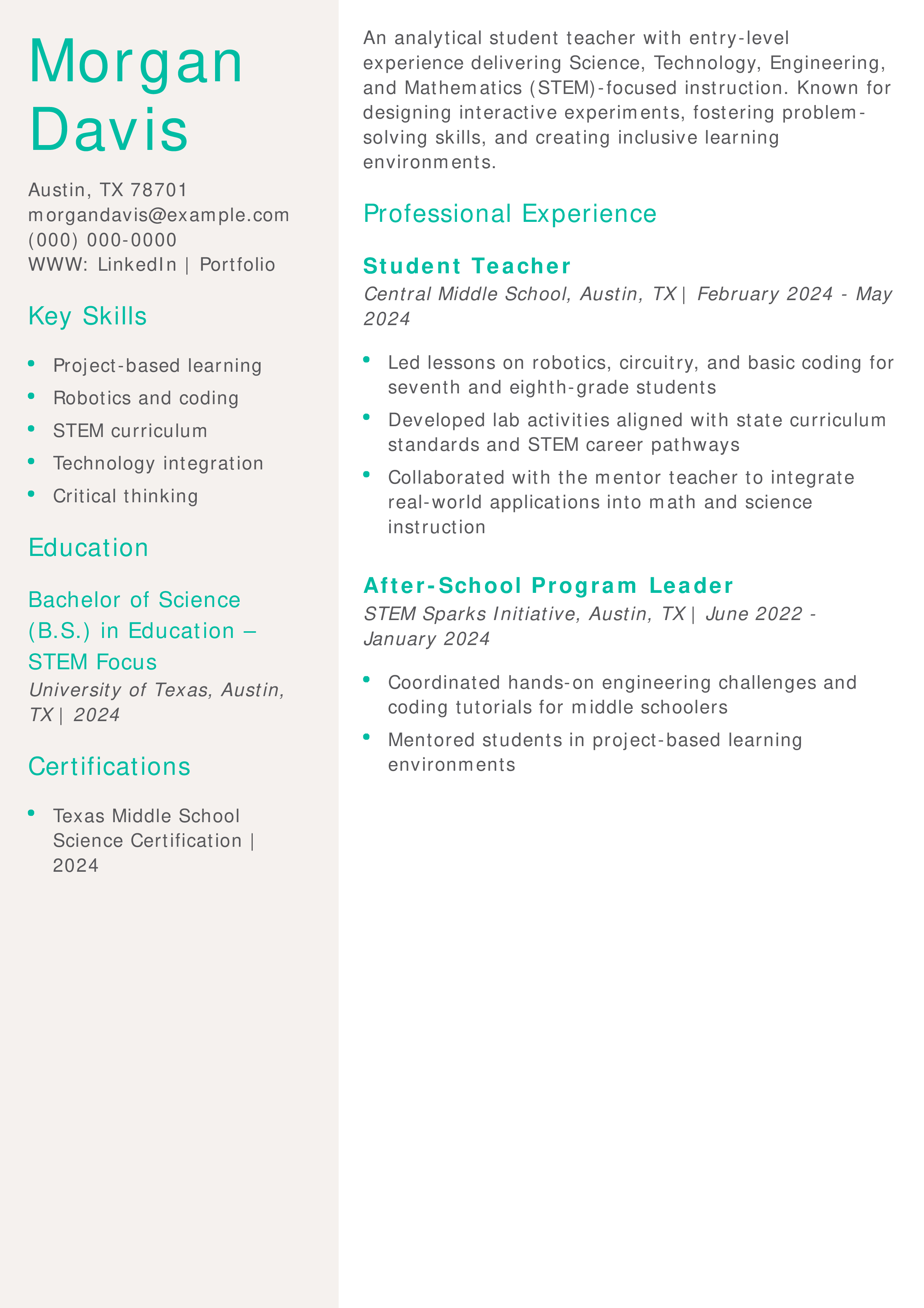 Science, Technology, Engineering, and Mathematics Student Teacher Resume Example