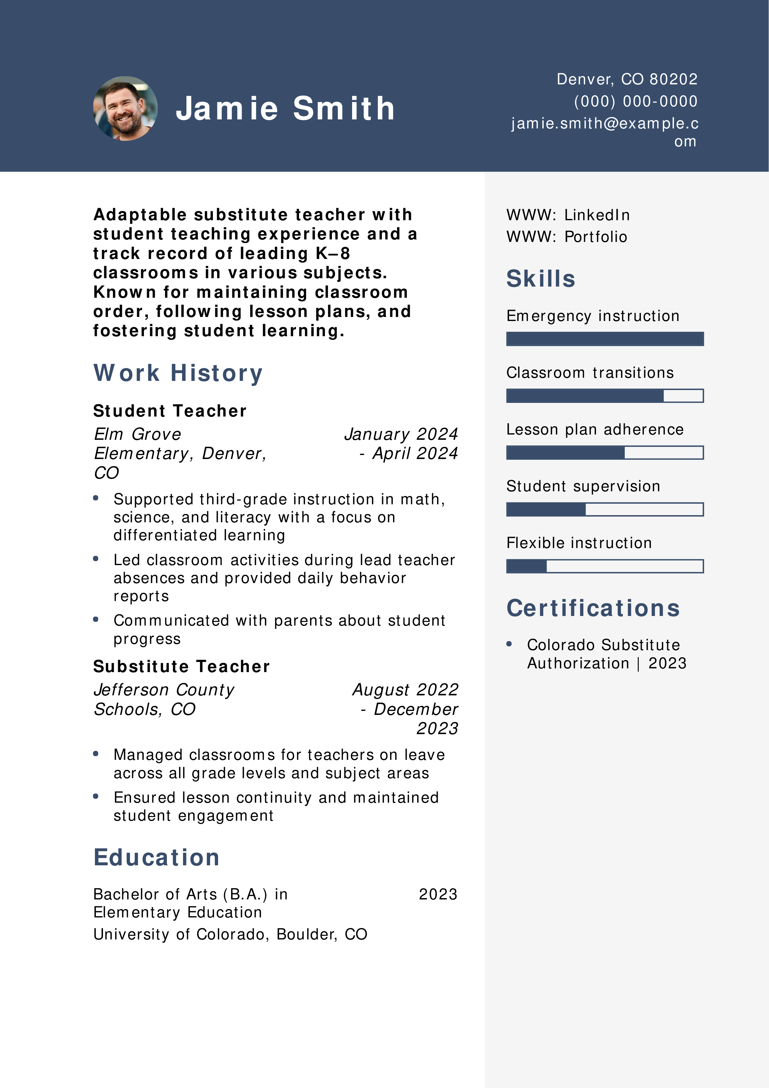This resume shows the ability to step into diverse classroom environments with confidence. Emphasizing flexibility and classroom control will appeal to schools in need of reliable substitute teachers. Learn how to tailor your resume to match specific job descriptions in How To Align a Resume with a Job Description.