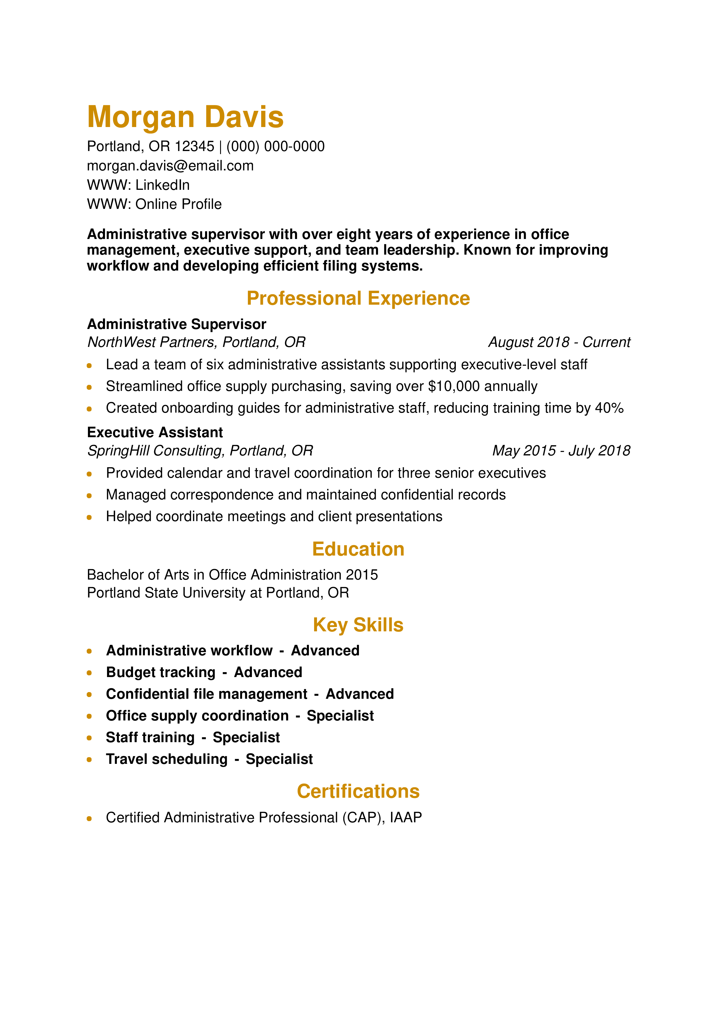 This resume blends leadership and administrative precision. Explore how to email your resume professionally by reviewing this resume email guide.