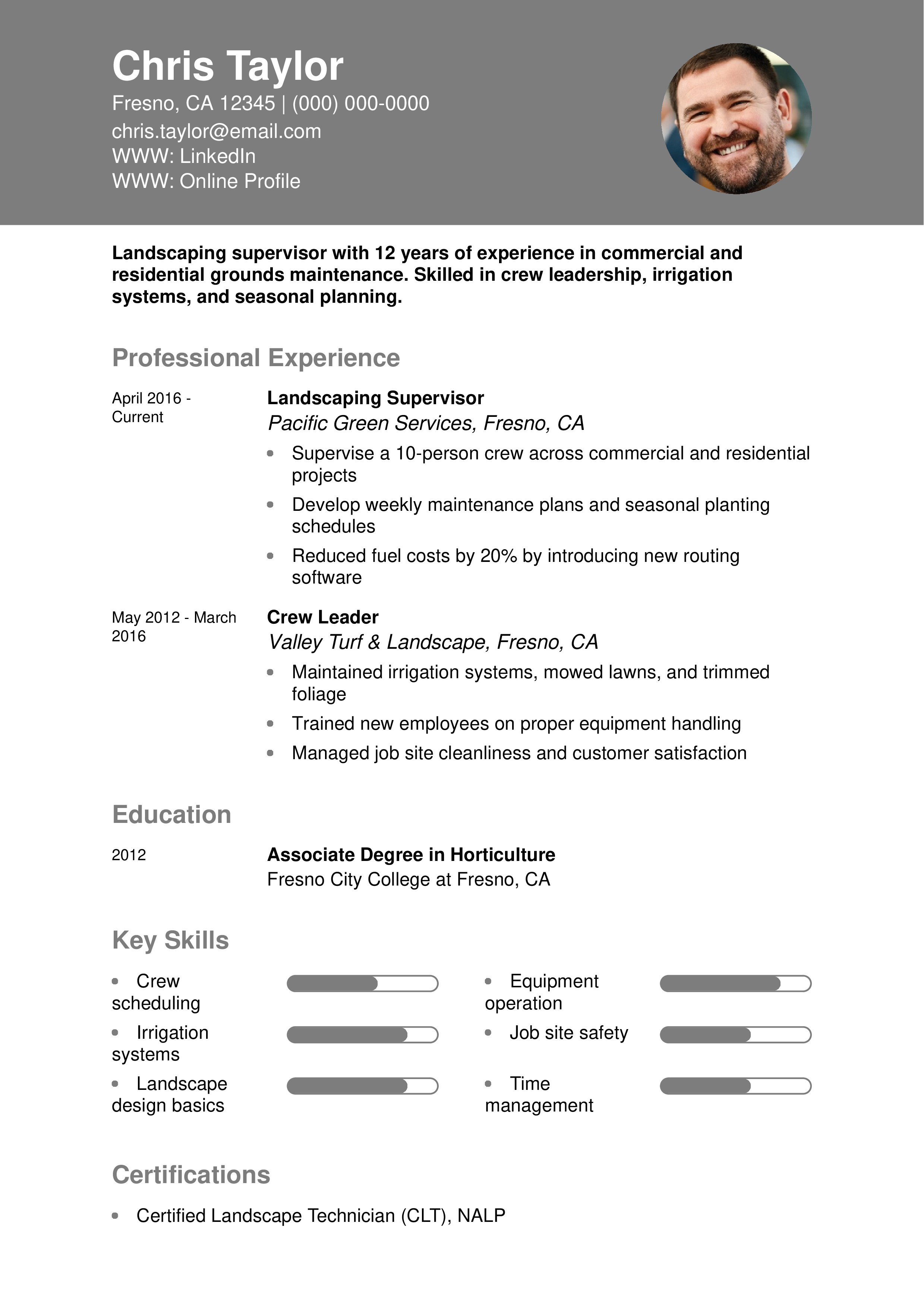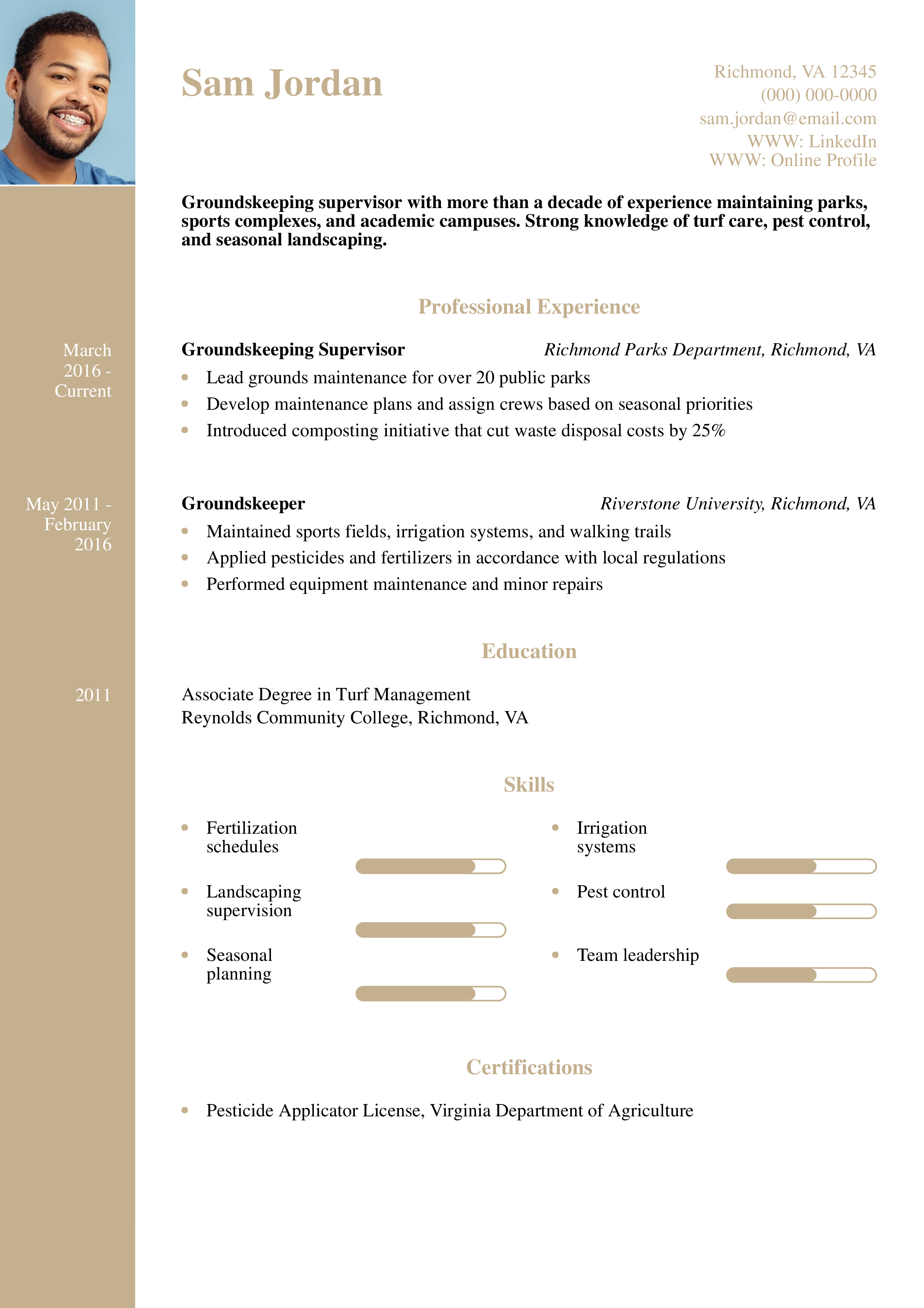 This resume emphasizes sustainable practices and technical skills in grounds maintenance. See how far back your resume should go based on your role and industry by reviewing this guide.