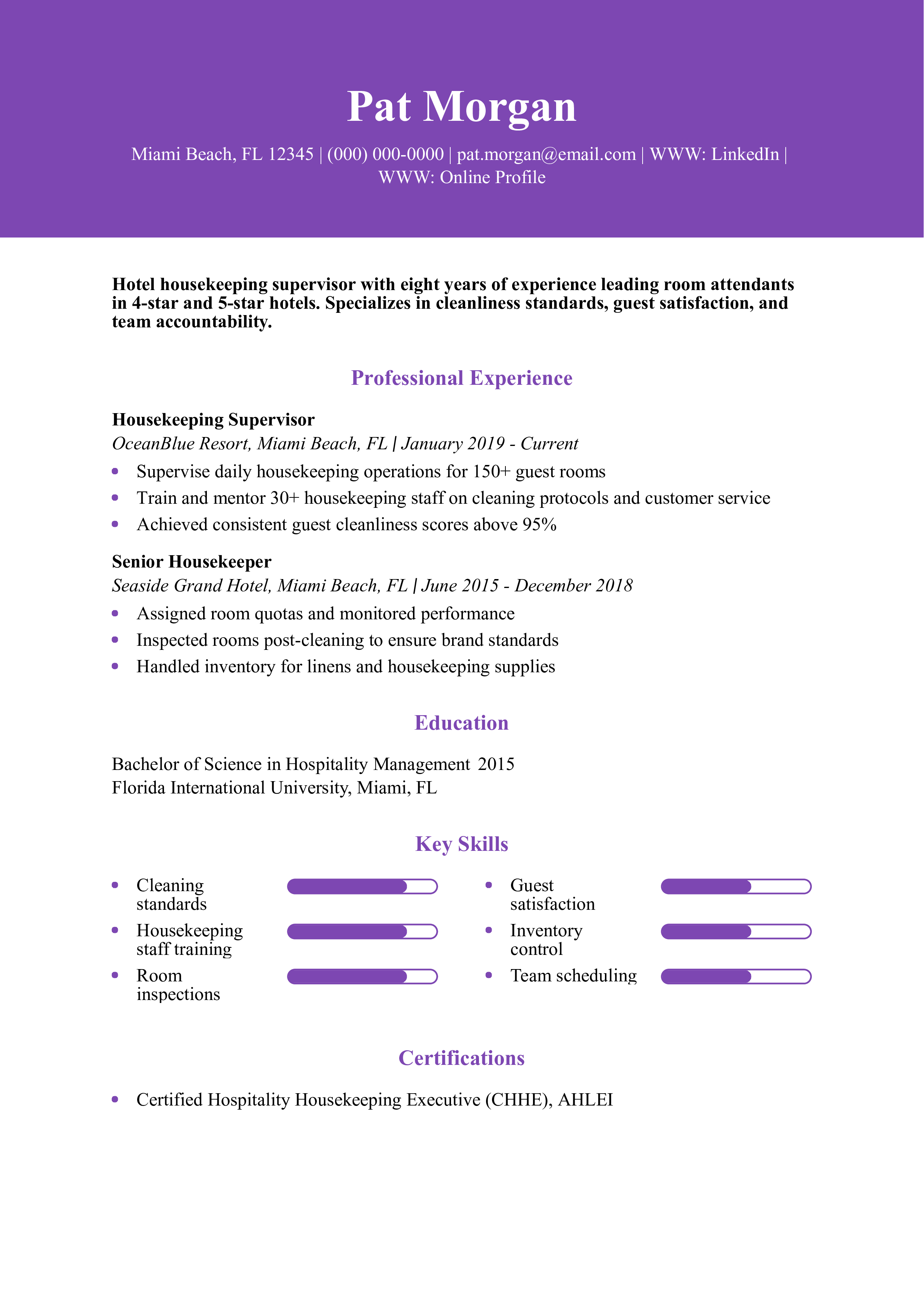 This resume ties room quality directly to guest satisfaction. Read how to feature hospitality-specific soft skills to appeal to service-focused employers.