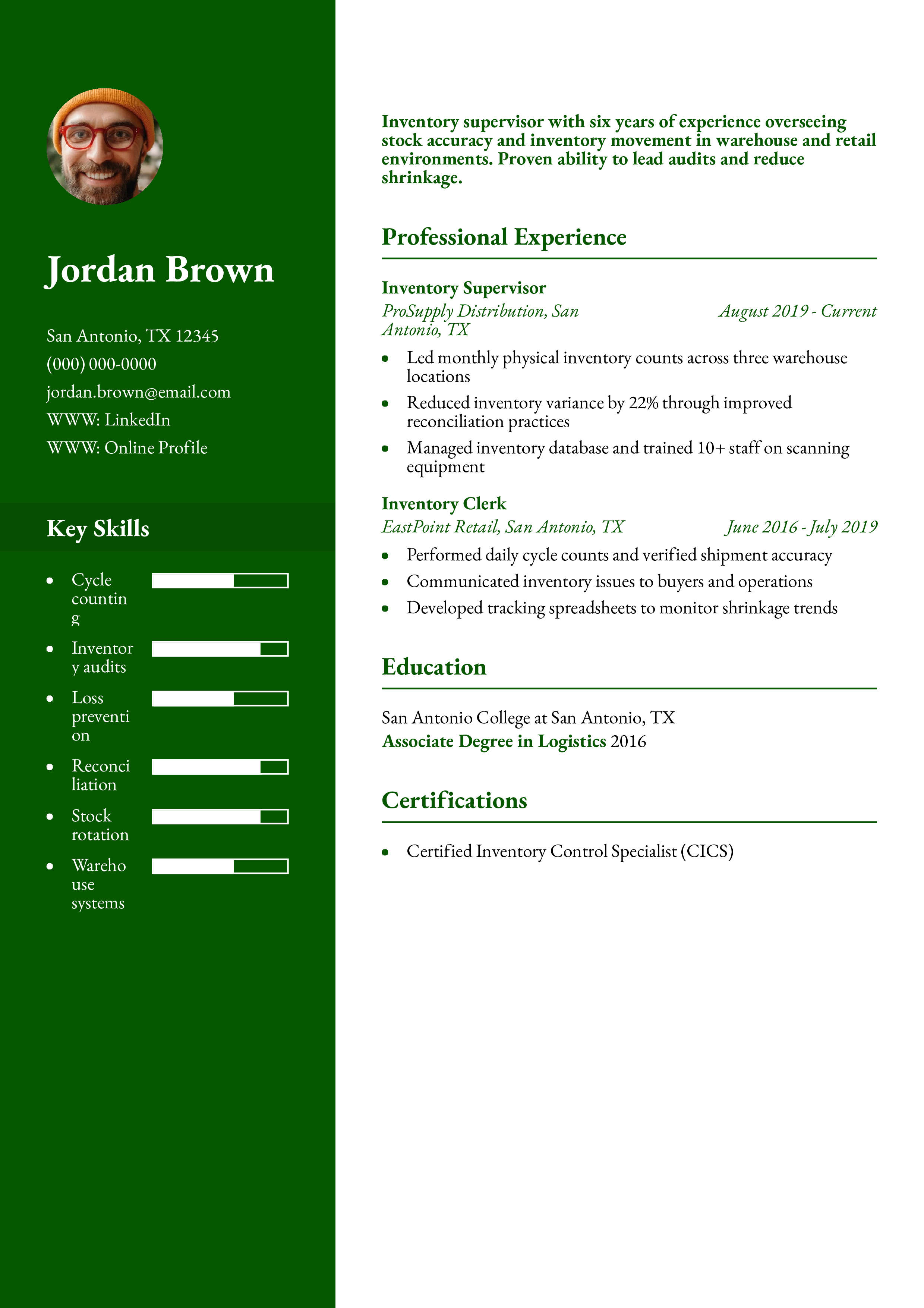 This resume shows efficiency and accuracy in inventory processes. Read how to include relevant education in a way that supports your career goals.