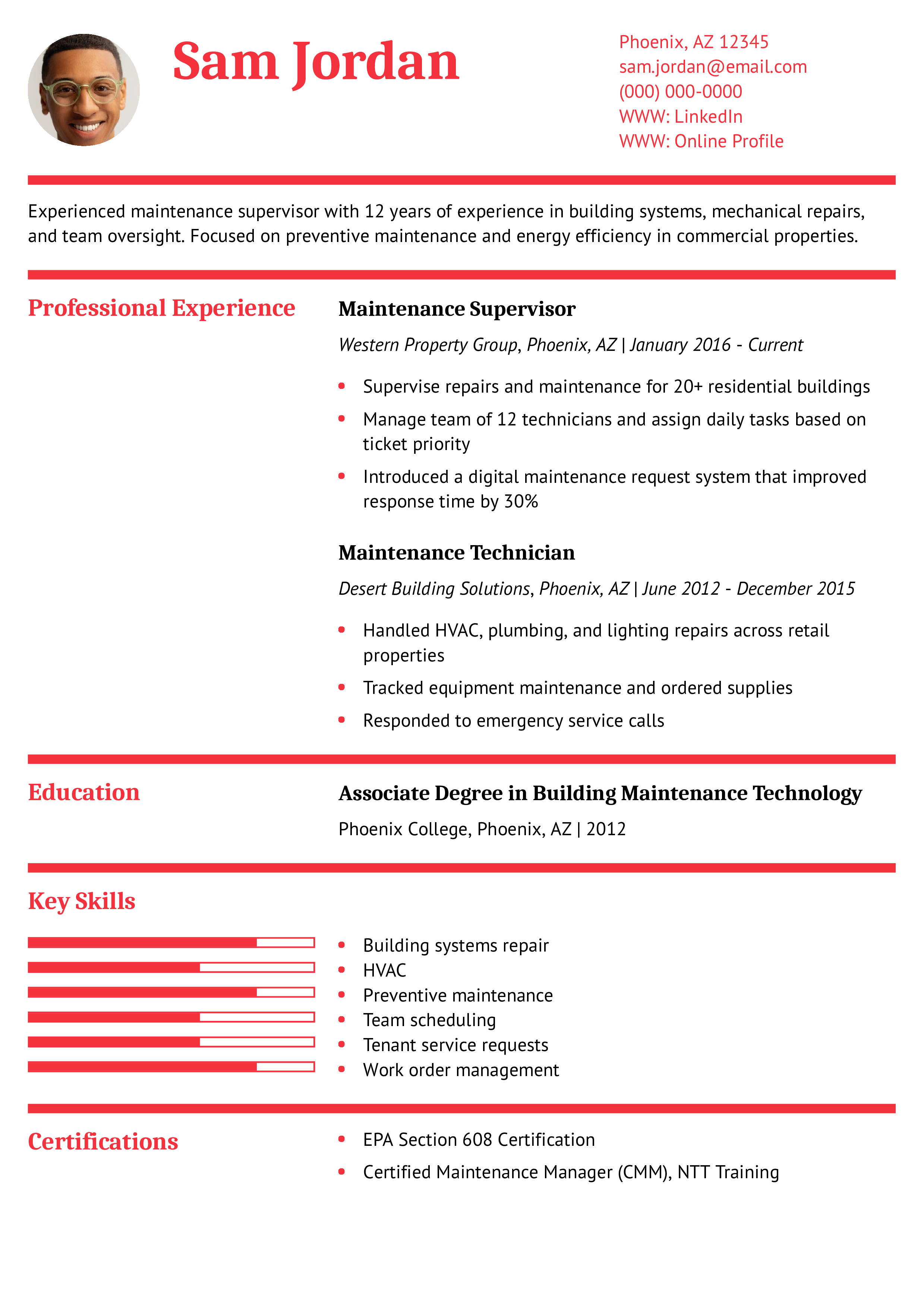 This resume emphasizes leadership in field-based roles and cost-conscious improvements. See how to format your relevant certifications to validate your expertise.