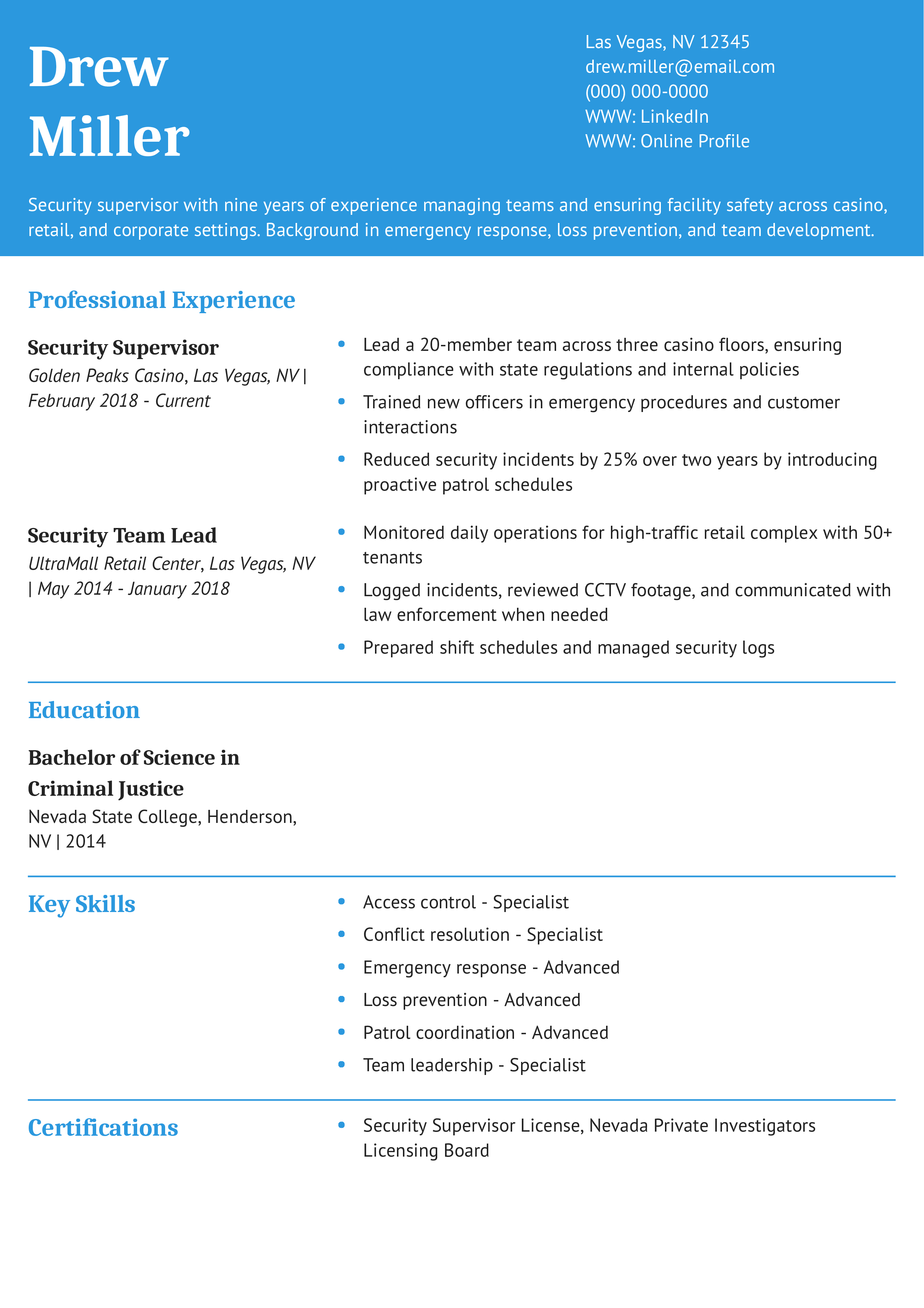 This resume stands out by combining incident reduction with strong leadership metrics. Discover to format experience with reverse chronological structure to emphasize recent successes.
