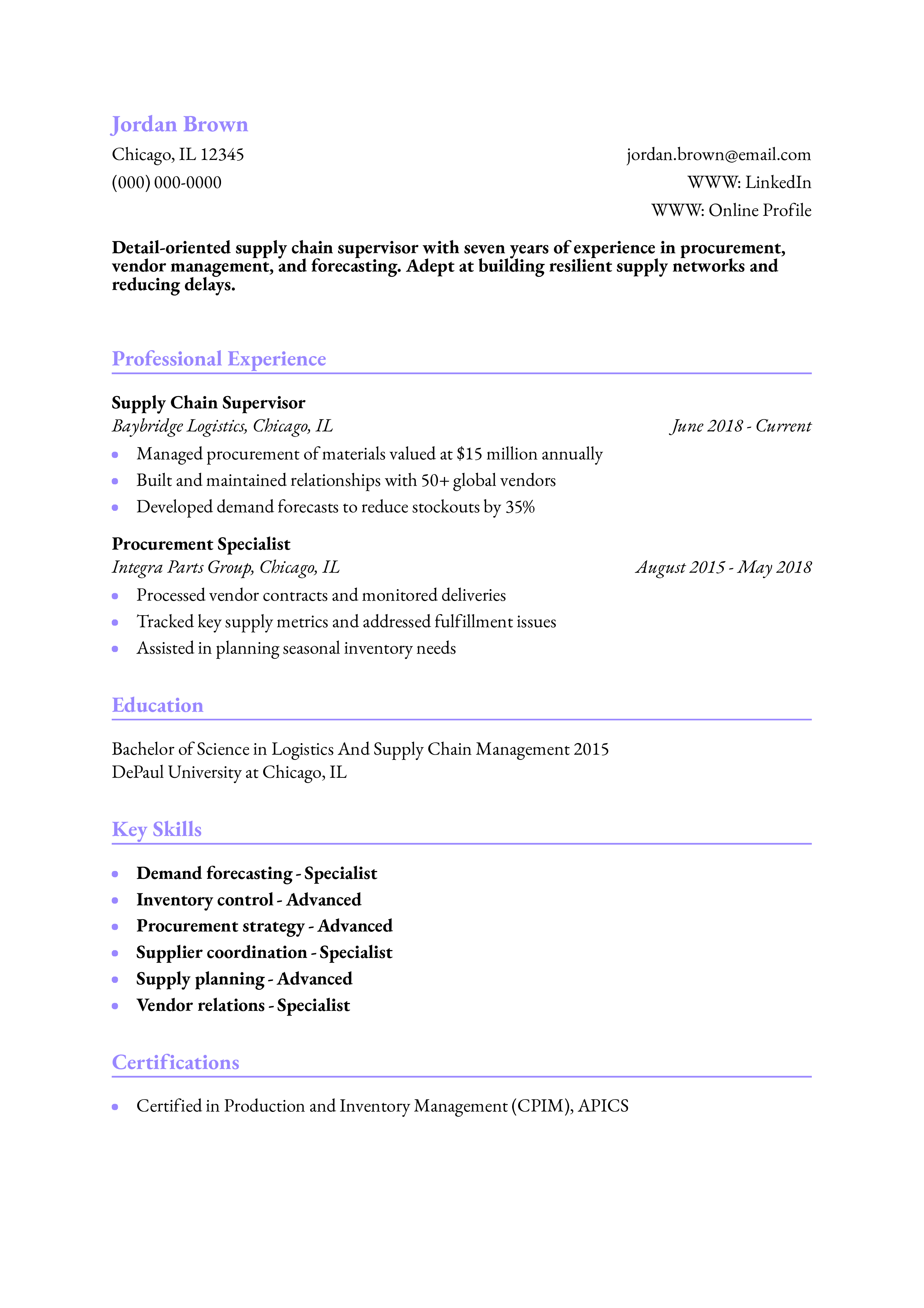 This resume showcases experience in both purchasing and inventory forecasting. Explore how to list technical and analytical skills to demonstrate your value in logistics.