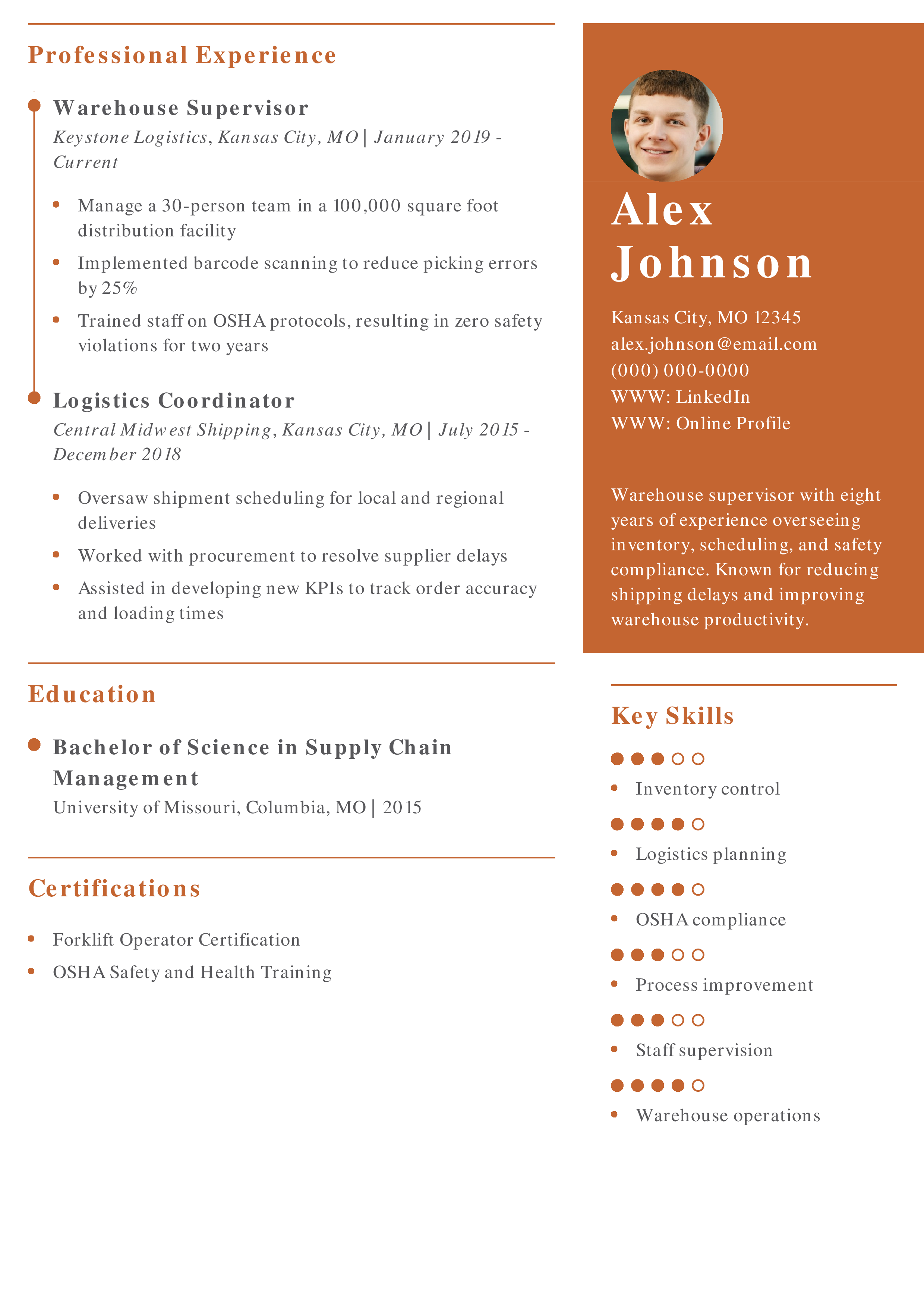 This resume demonstrates measurable improvements in warehouse accuracy and safety. Check out how safety training and certifications can make your resume more competitive in operations roles.